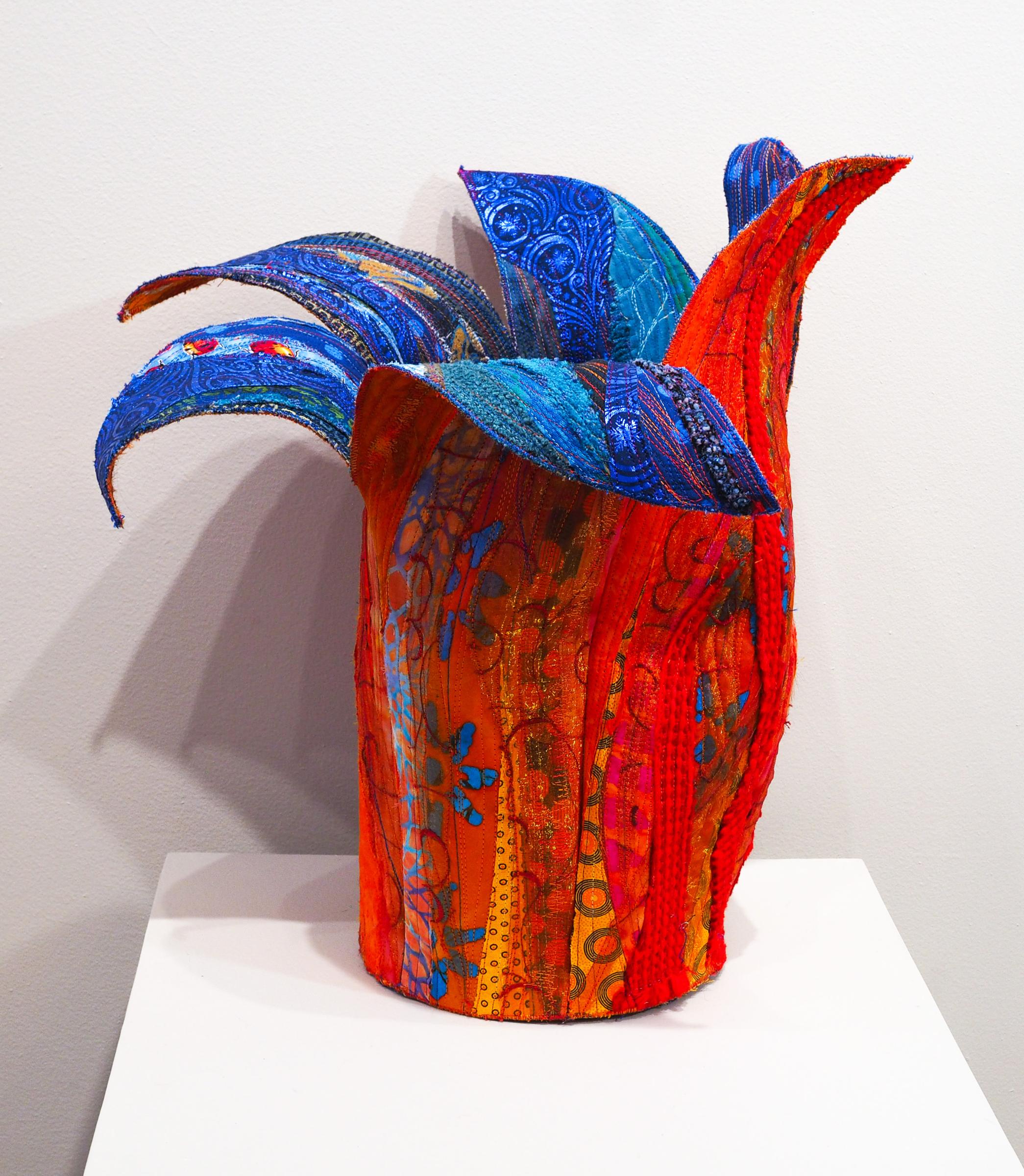 I bring texture to my work using a variety of materials, from conventional quilting fabrics to recycled designer upholstery samples, quilts I’ve made, and the liberal use of thread. I must take gravity into account as my art has escaped the wall to become sculpture, completing the three-dimensional path I'm on. Standing in front of my wall of collected fabric, pieces will catch my eye and bring color, texture, or pattern to the work. The receptacle series started with a ‘What if?’ question while making some of the structures for my botanical series. What if I leave these pieces open?
