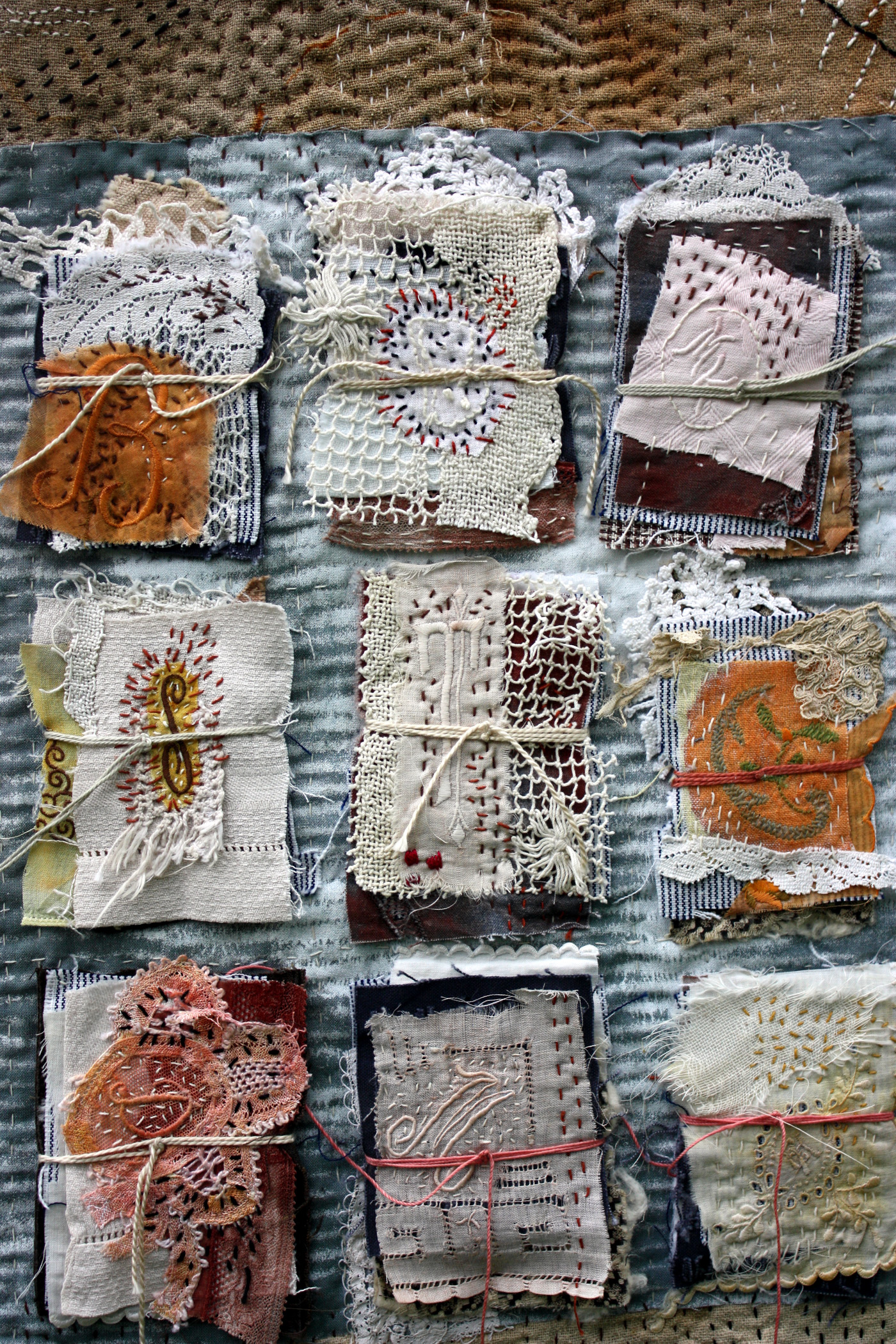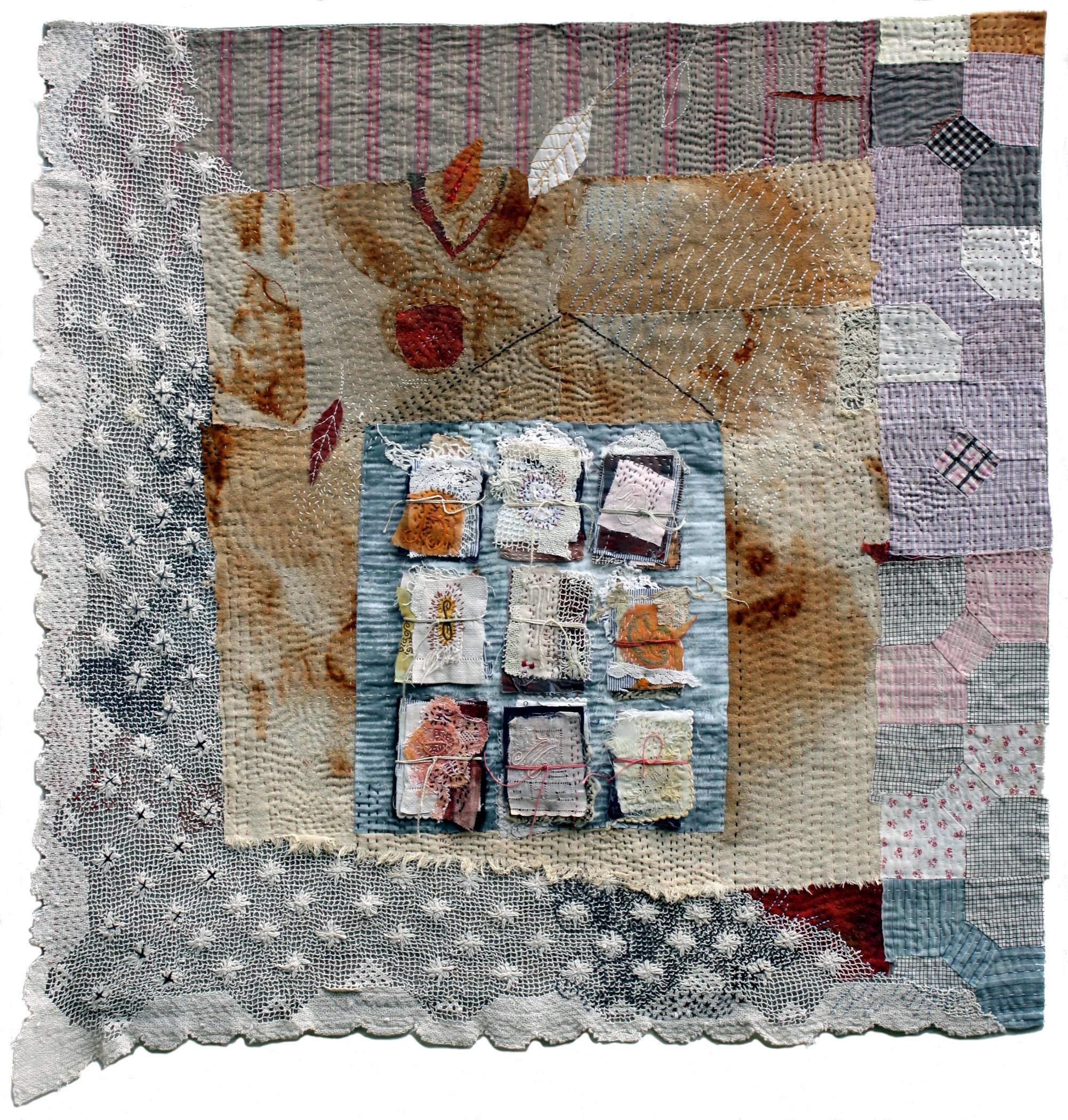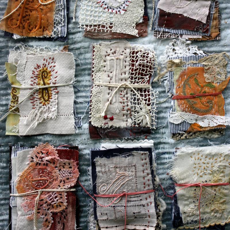 Recollected is a series of work created with domestic textiles of lost provenance. I have always enjoyed working with materials that have lived other lives and been touched by other hands. Stitching slowly with the lovely handwork of unknown needlewomen made me mindful of the textile legacy we have inherited and the one we will pass on.