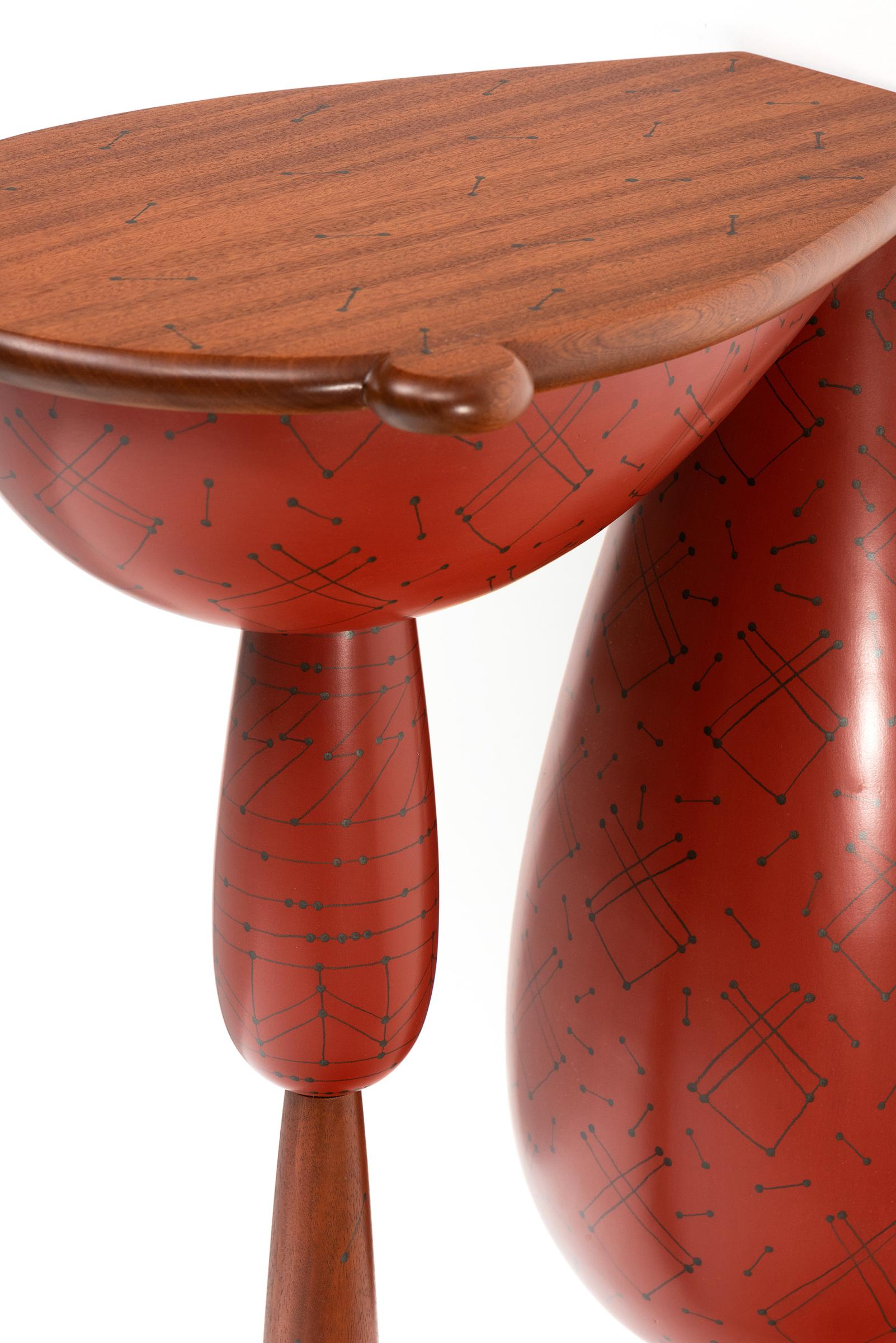Red Patchwork Demi-Lune Table is a lathe-turned, painted wooden table that features a stylized Seminole patchwork motif. I am a citizen of the Seminole Nation of Oklahoma and have chosen to honor the patchwork tradition through the creation of hand-drawn stylized patchwork designs. Seminole patchwork is used to adorn garments, such as skirts, jackets, and vests, and the rows of patterns traditionally consist of bold colors of intricately pieced fabrics. I have transcribed the patterns into line drawings and freed them from the horizontal bands in which they're traditionally oriented.