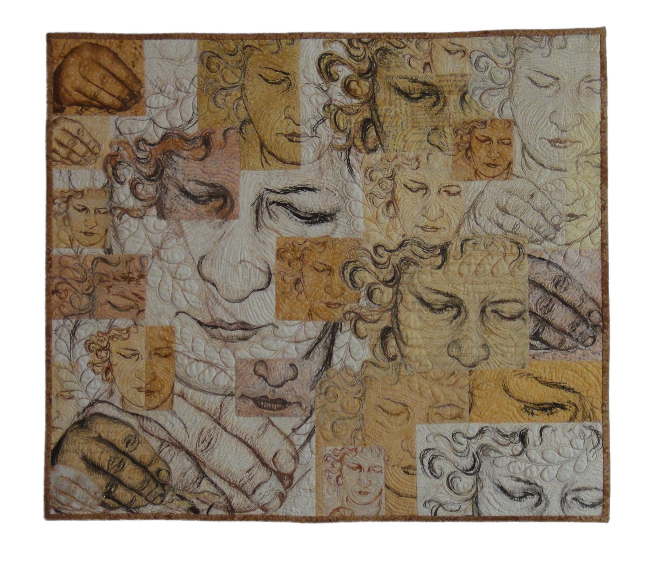 After a 20 year break, I decided to finish my Fine Arts degree. As my time at college was coming to a close, I took Beginning Lithography and Advanced Lithography classes. The focus of these classes was printing on paper, but on my own time I chose to experiment with printing on cotton fabric as well. At the end of the two classes, I took my samples and made this composition. The quilt top was presented in class for the final critique. Most of the students had never seen any fiber art before. The quilt was also shown in the Senior Show, which was exciting to me since I had been told that fiber art was not fine art.