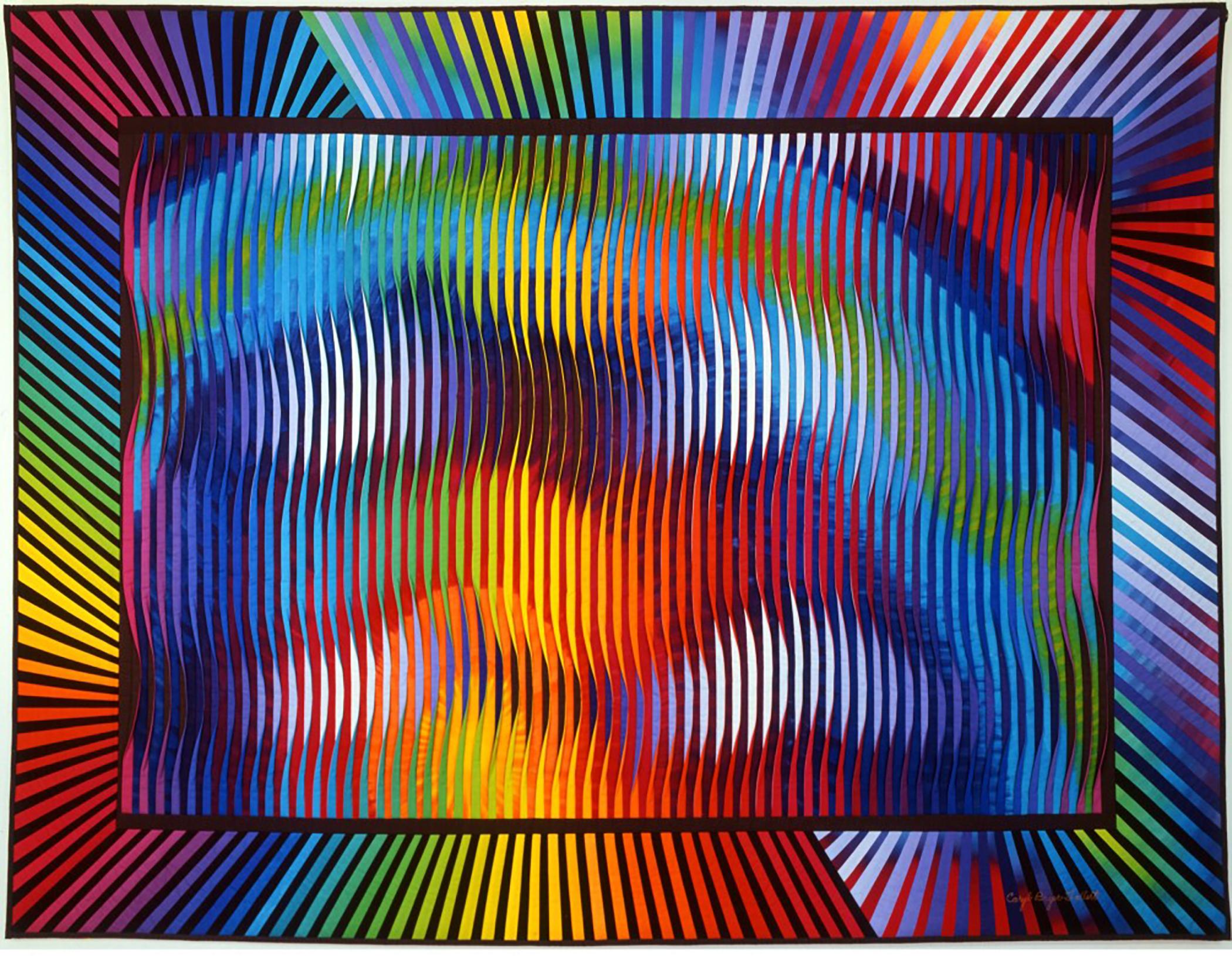 Each of the �" "tucks" was constructed from two different fabrics. The right sides of the tucks are made from fabrics dyed in a forty-seven-color gradation of pure rainbow hues. The left sides of the tucks graduate from black to deep blue-violet to white. The use of color and value (light to dark) gradations, and the twisting of the tucks from side to side, create the illusion of movement and light across the surface of the quilt. Because different color gradations are used on the right and left sides of the three-dimensional tucks, the appearance of the quilt can be changed significantly by changing your point of view. I like to call the quilts in this series "viewer participation art."