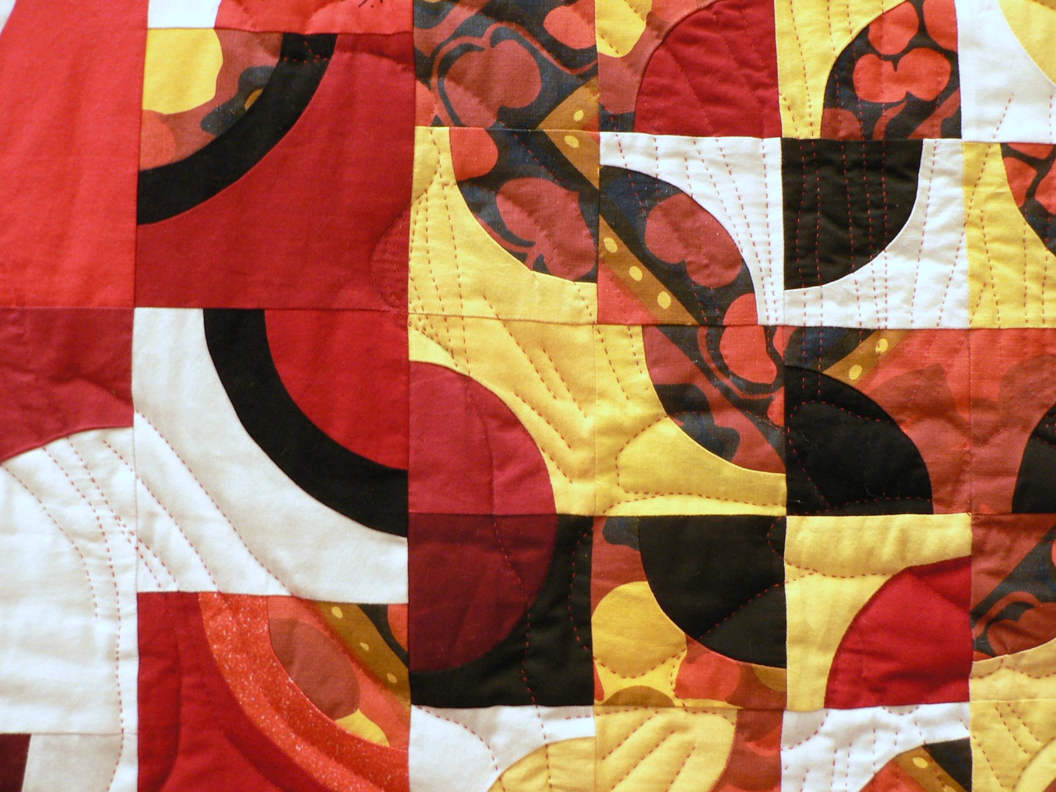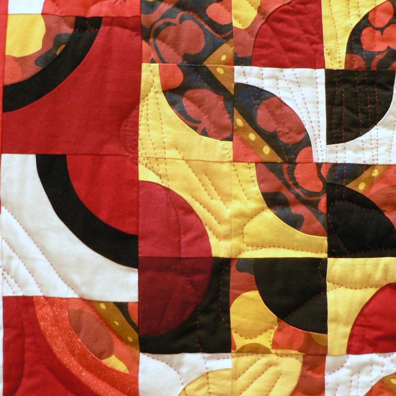 Intense reds, yellow light, and spicy hot flames grow in size as they engulf outer boundaries. Hand-quilted textures appear to be waves of heated air or perhaps streams of water flowing over the fire. Geometric increases in size govern these shapes. They are a variation on an old quilt pattern: King Solomon’s Puzzle or Drunkard’s Path. Erratic movements suggest abstract flames.