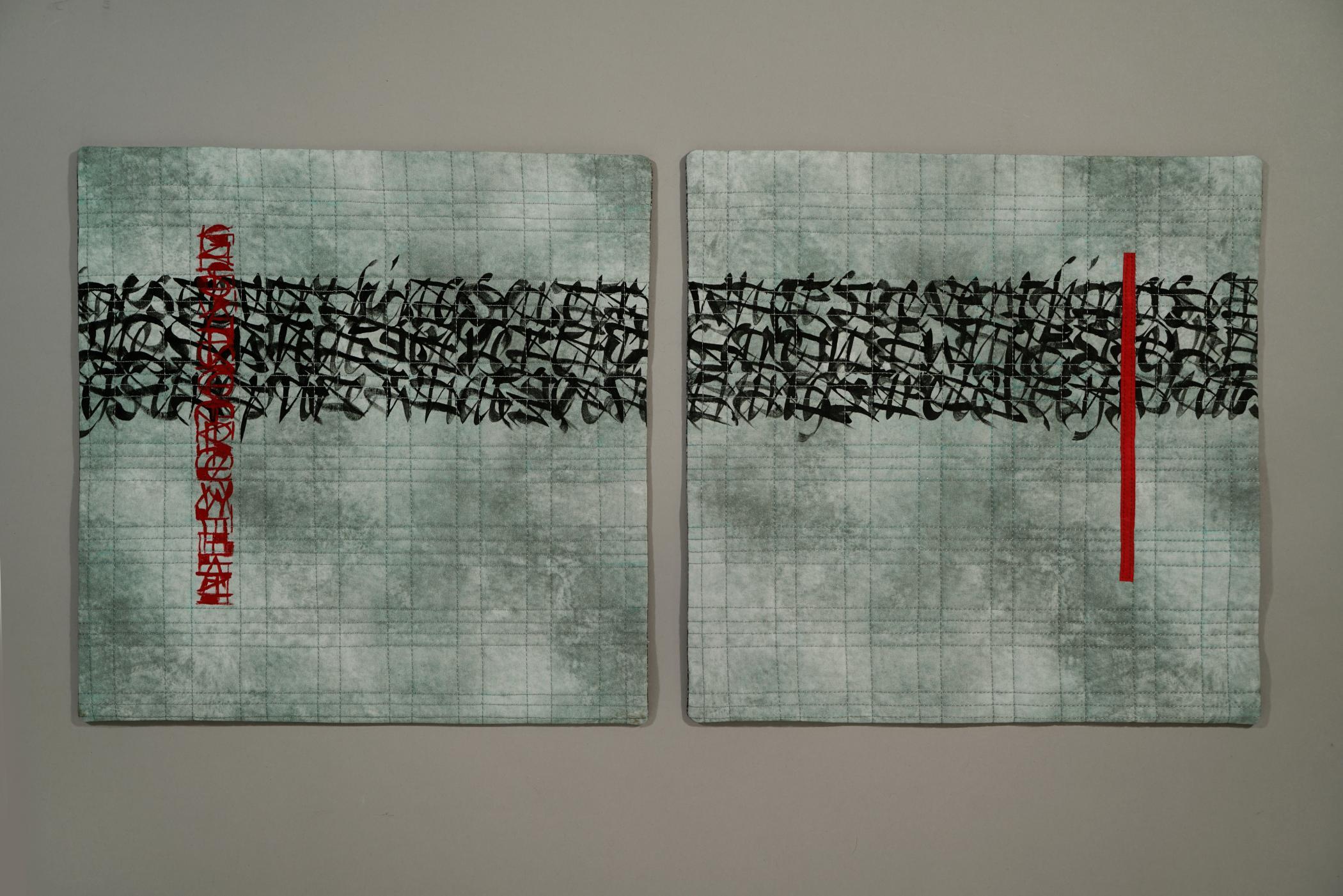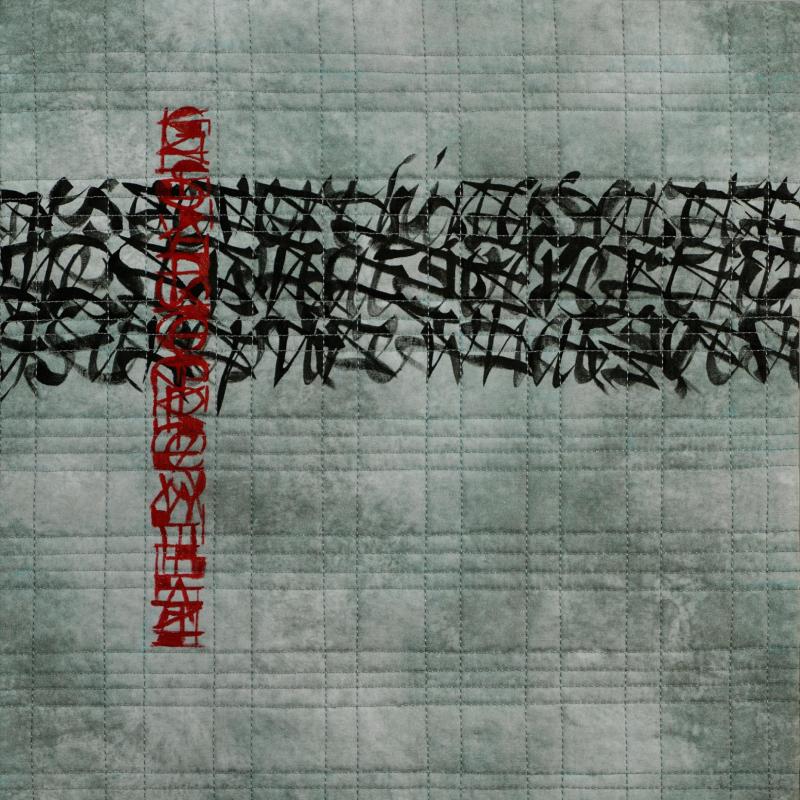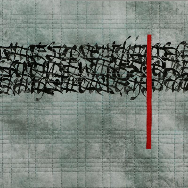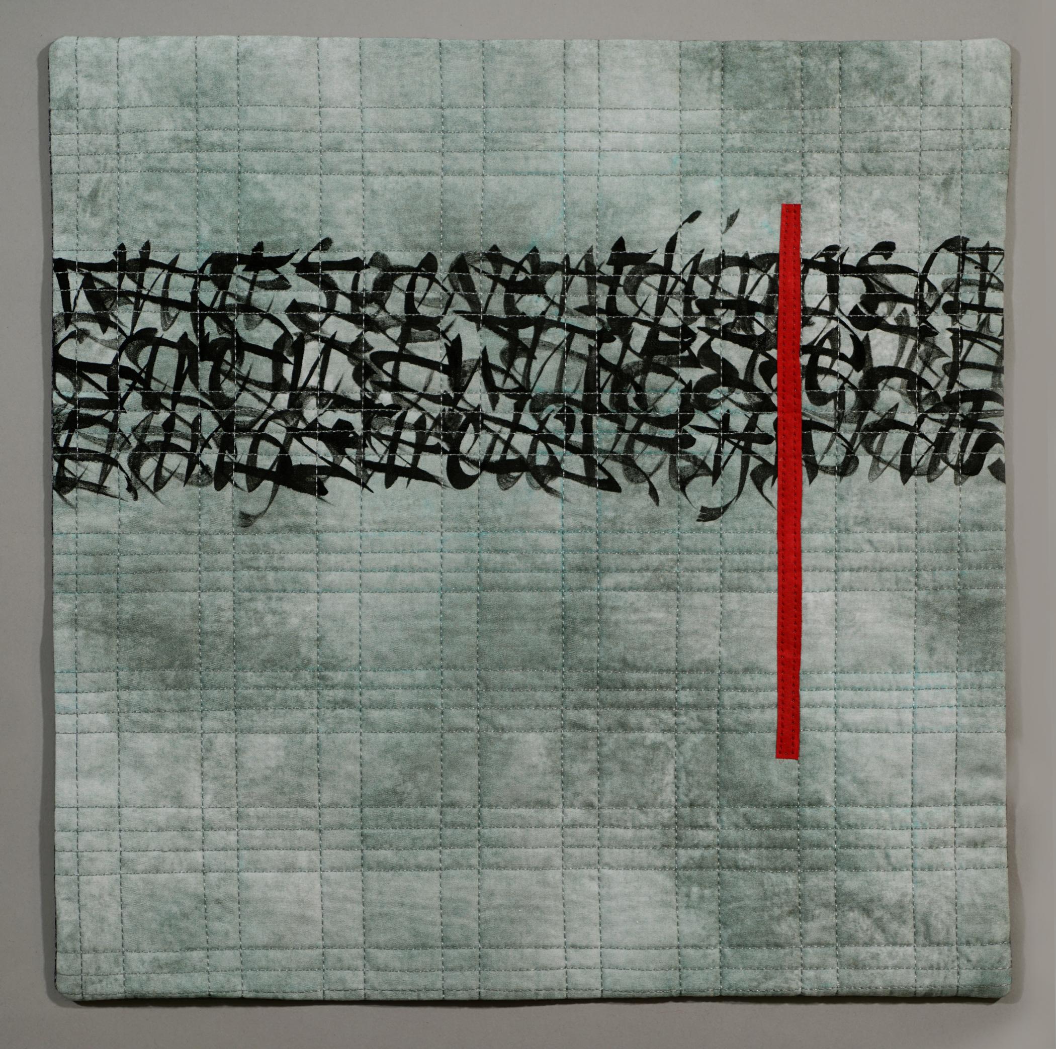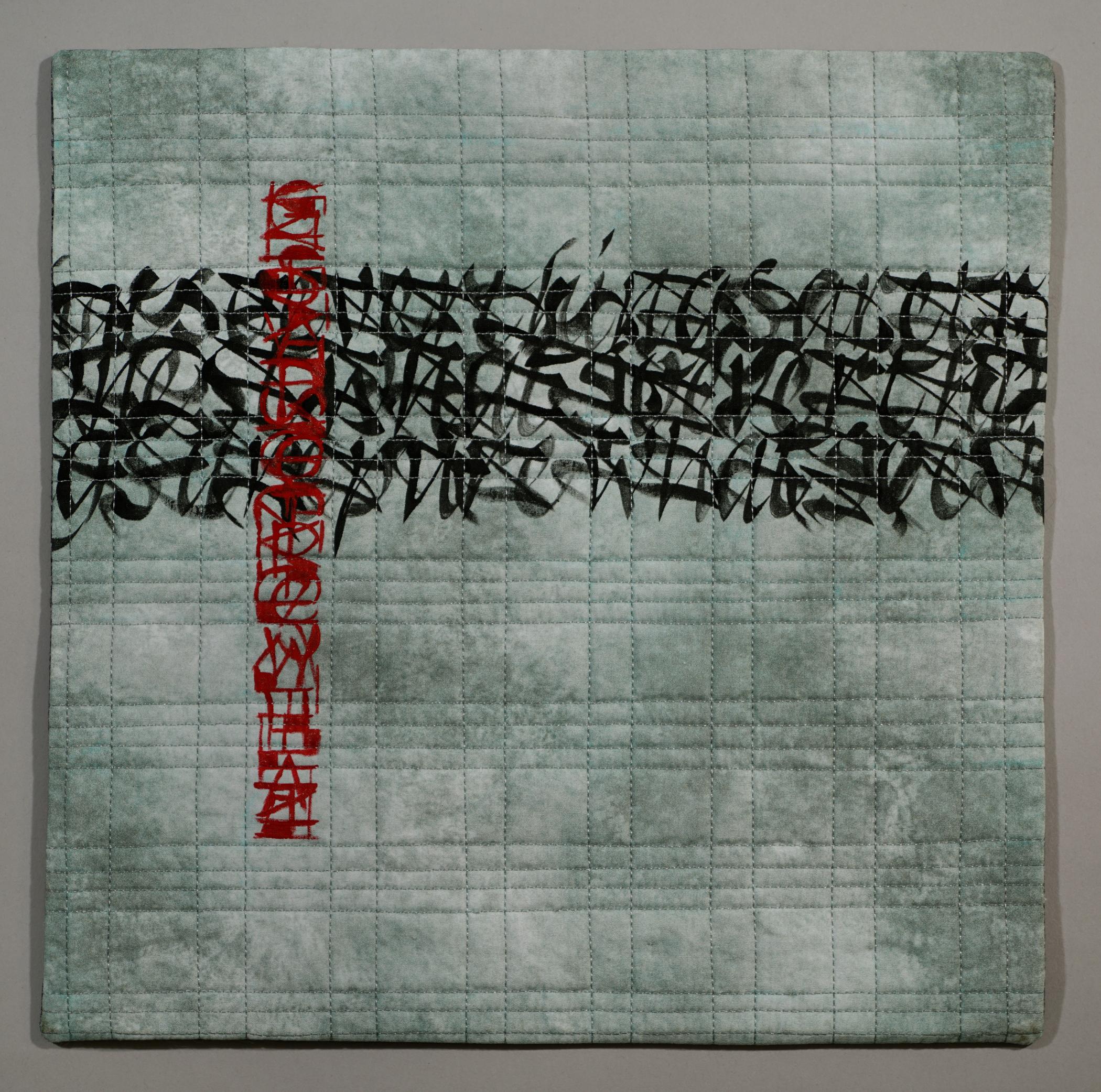 Stacked writing on whole cloth: phrases are brushed onto whole cloth with acrylic paint without regard to space, first horizontally then vertically