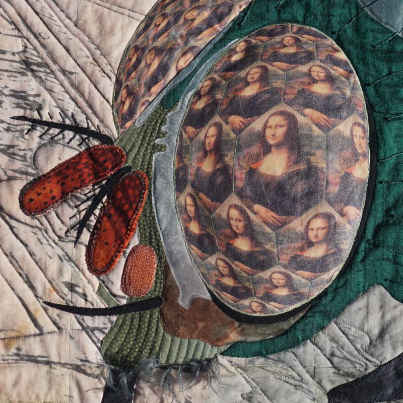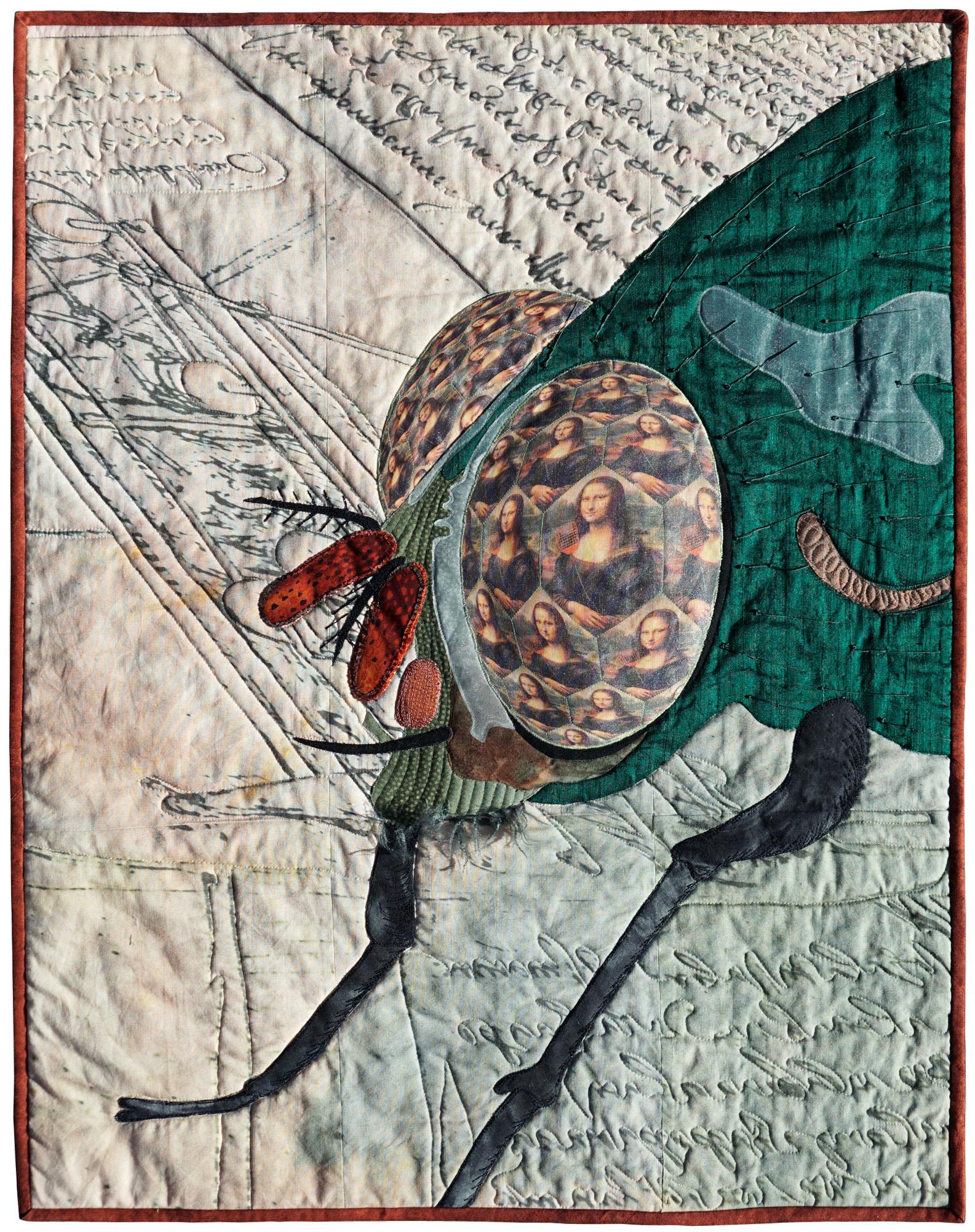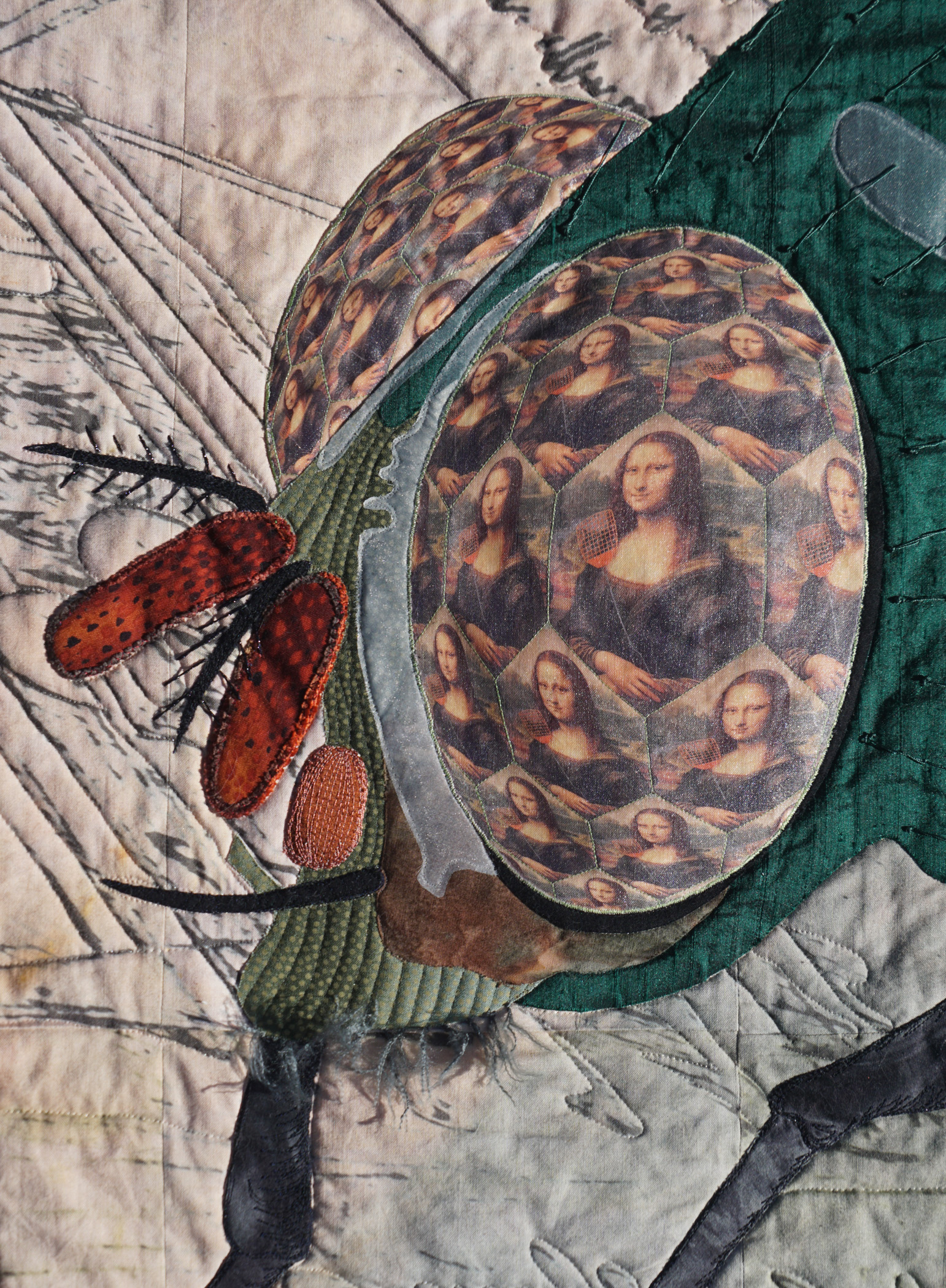 As a member of the Adirondack Regional Textile Artists' Alliance, we would select a word or idea to spur creativity. One selection was Bugs. I had recently been an art courier for my museum's drawing of the Mona Lisa (attributed to Leonardo da Vinci) in which she is holding a feather. What if she was bothered by a fly during her portrait sitting? A flyswatter replaced her feather and is reflected with her in the fly's faceted eyes while he is on a surface scattered with da Vinci's drawings.