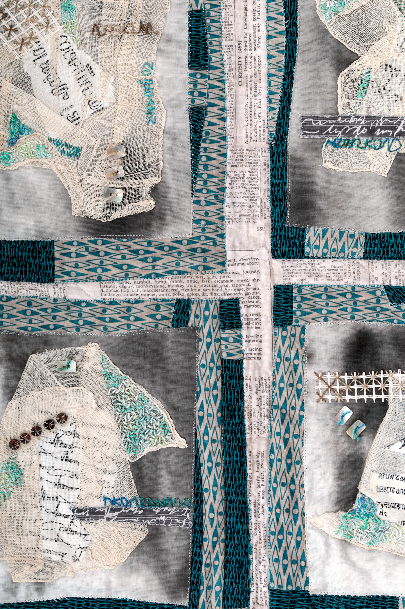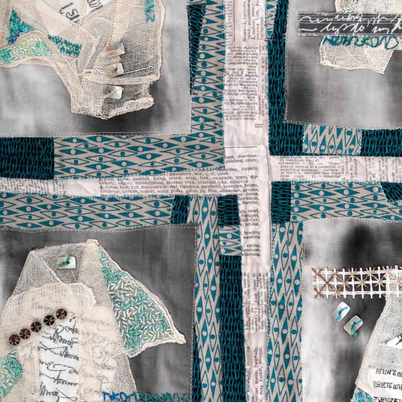Retrieved Memories is part of a series of art quilts in which I use text and calligraphy as a form of mark making. My aim is not legibility but rather depicting symbols that stand for a universal form of communication and connection.