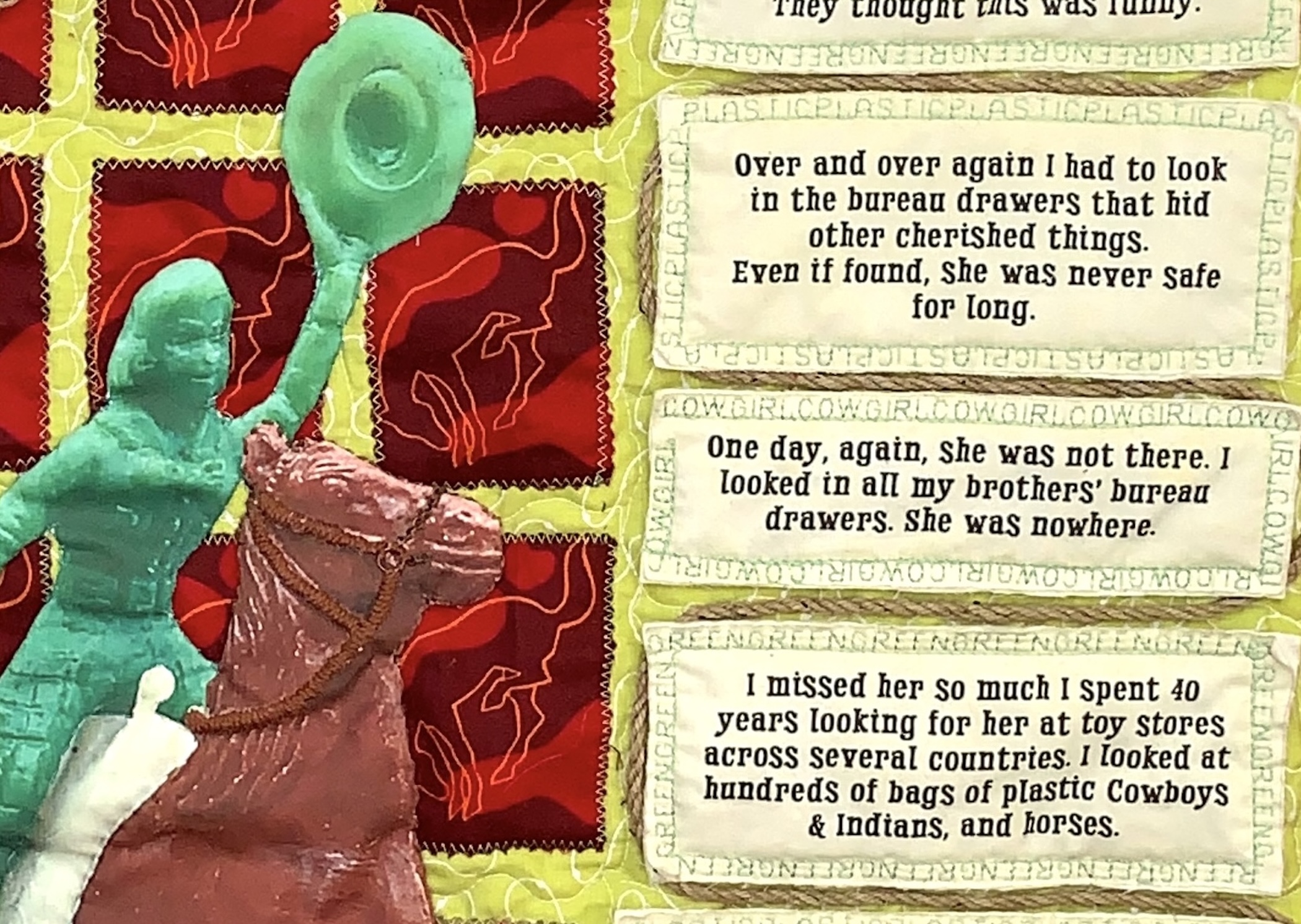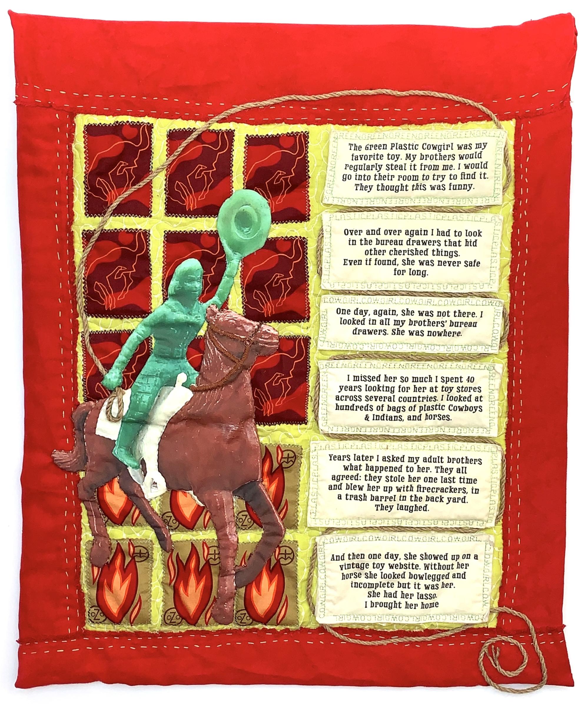 This green plastic cowgirl joyously riding her horse and swinging her lasso and hat was my favorite childhood toy. When she was destroyed, her loss was oddly felt by me for decades because she clearly represented a type of freedom and excitement a shy little girl could only dream of. When she rode back into my adult life (via a vintage toy site online) our journey together was complete. Now she rides on in this story quilt.