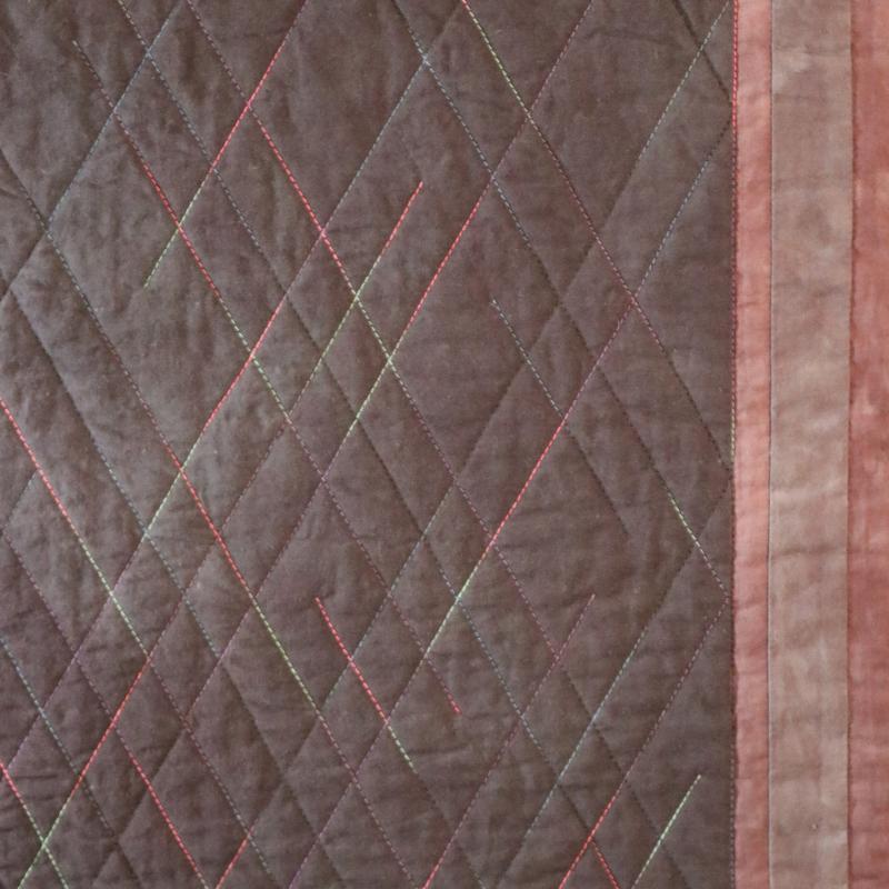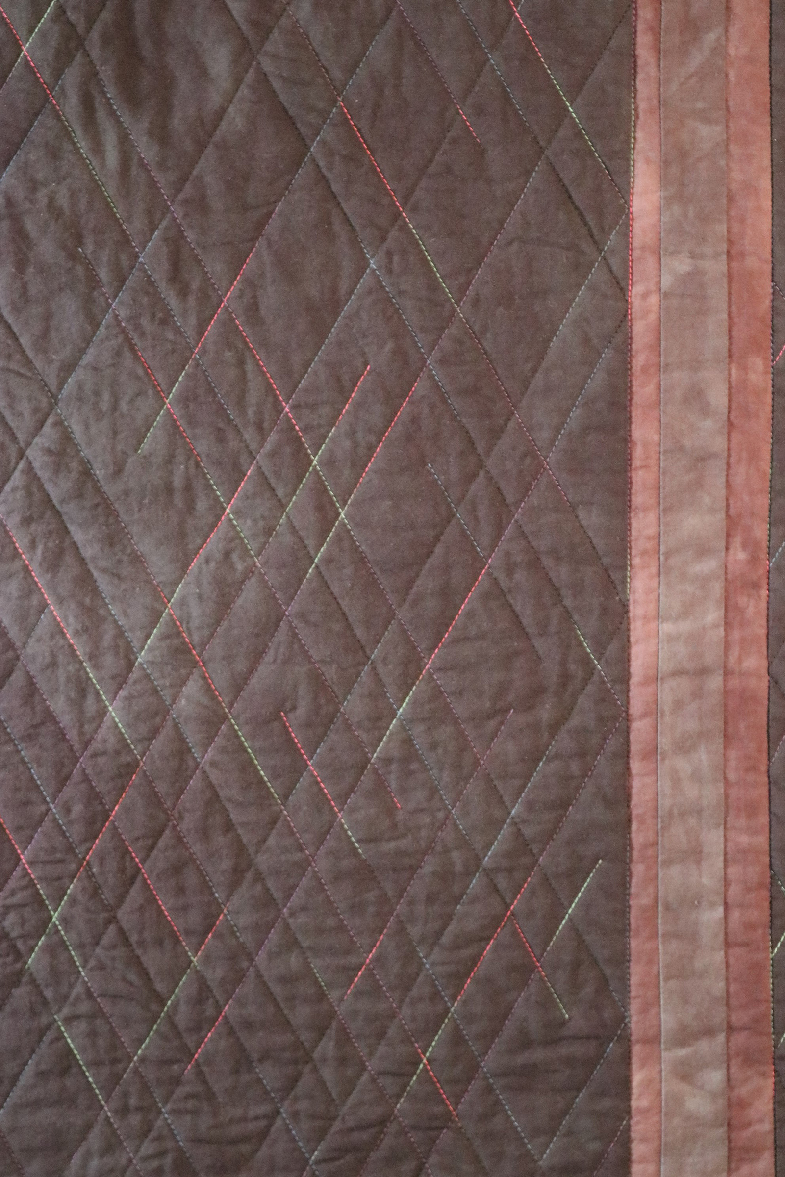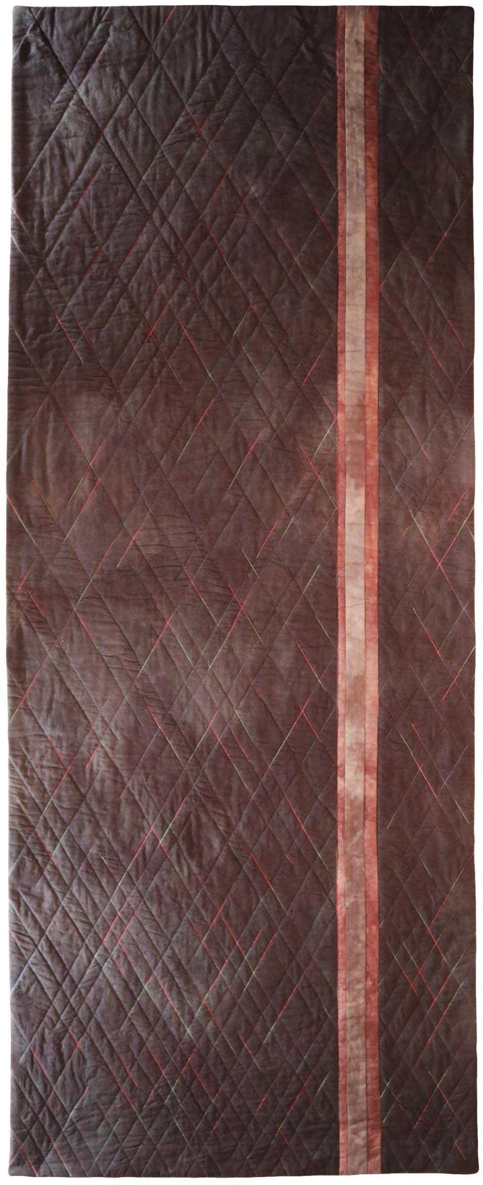 The muted tones in this piece suggest a somber passage towards a quiet place. Use of the traditional sashiko pattern Narihira Waribishi (overlapping diamonds), with increased spacing, supports the sense of movement from bottom to top; therefore, towards peace and serenity.