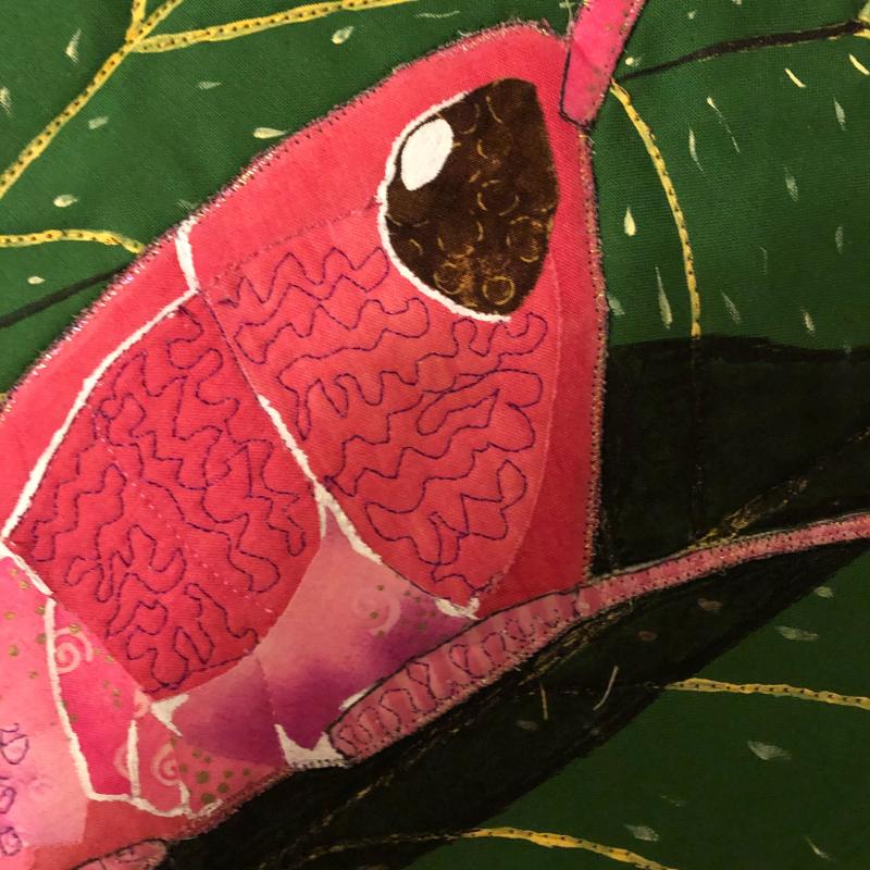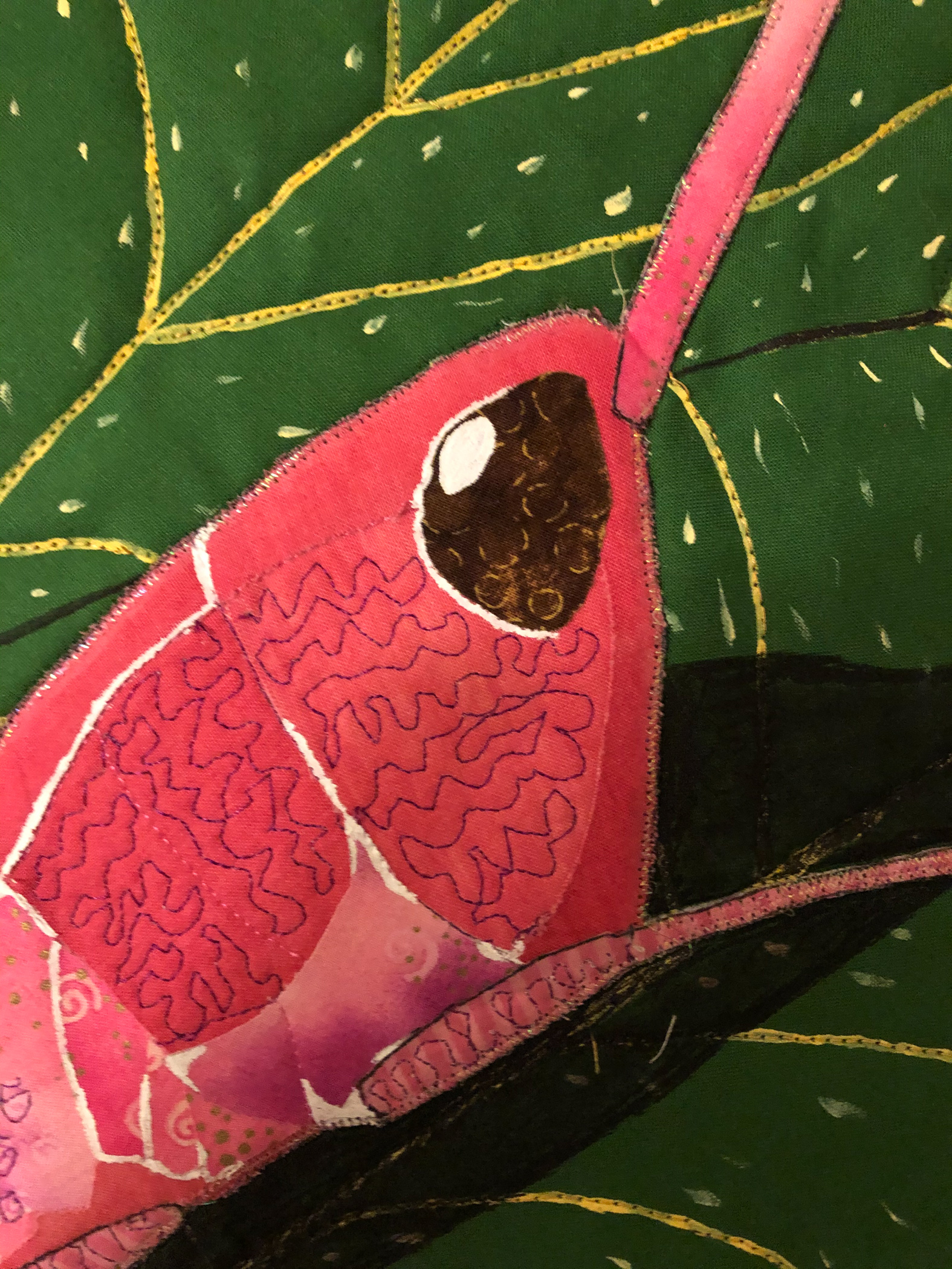 Browse the Collection ROSIE Phyllis (Perlie) Petrillo Size 23 in x 22 in (58 cm x 56 cm) Year 2021 Gallery Bugmania! (SAQA Virtual Gallery) Price $0.00 Buy Now >> I fell in love with an actual PINK grasshopper and just had to create it in an art quilt. I found this silk background on the 'free' table at my guild and knew I'd find a use for it someday. Rosie is very happy to be posing for everyone to see!