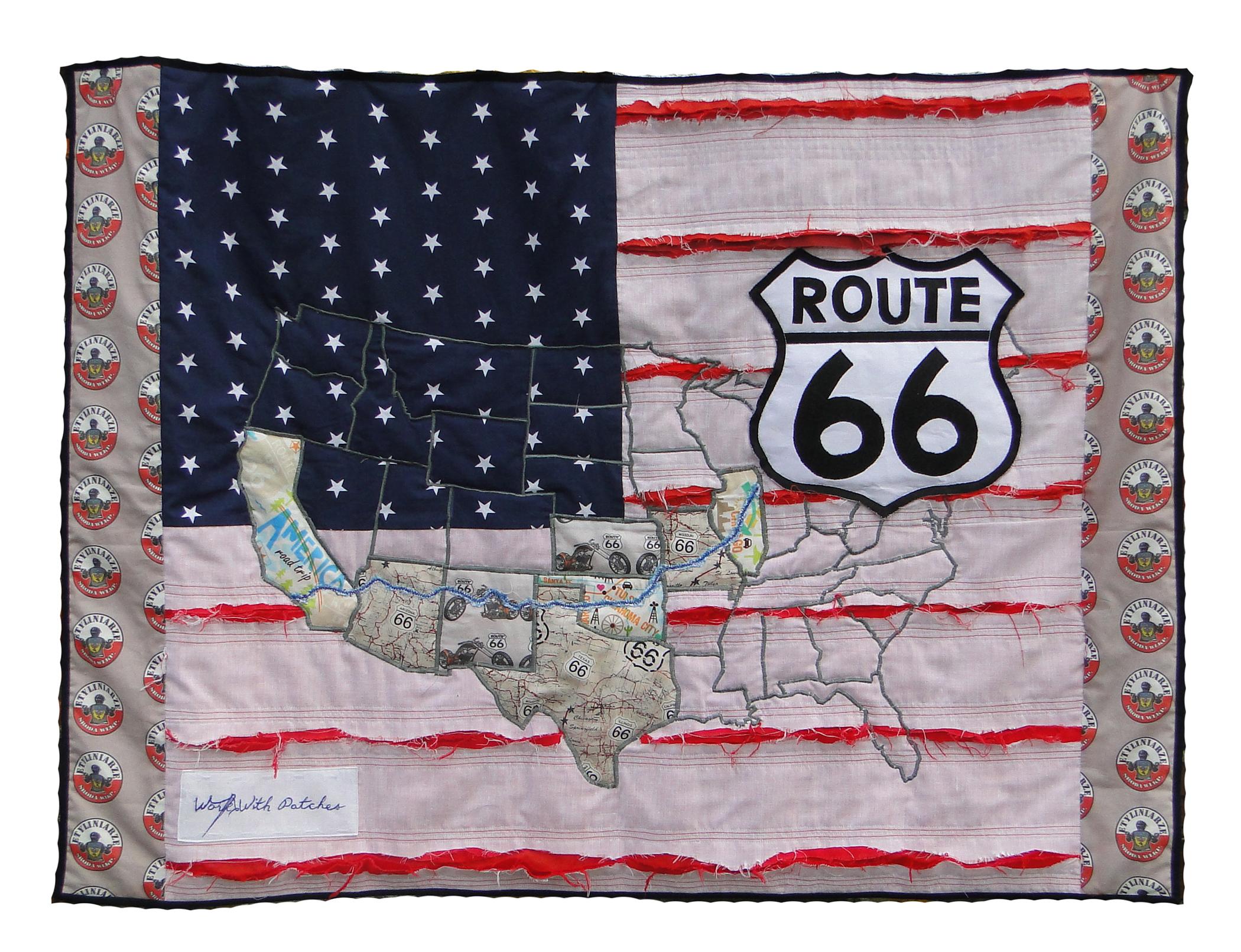 I applicate 8 states crossed by the Route 66 themed fabric. The other of USA territory is marked only with quilting. All country shape lay on the national USA flag.