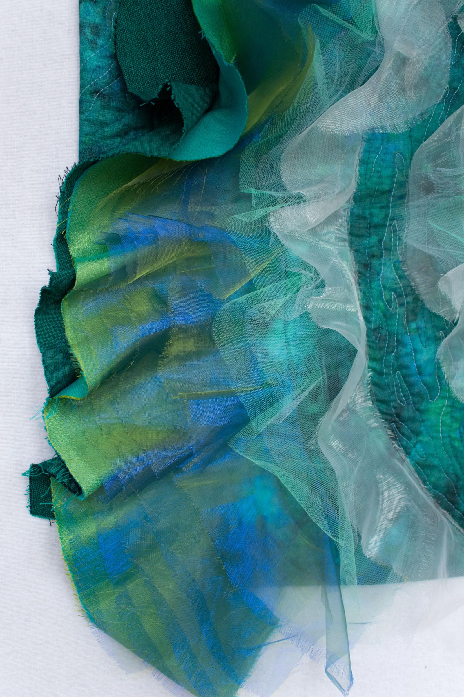 This quilt was made for an exhibition themed "Making Waves". Although the theme calls for interesting metaphorical interpretations, I opted for literally making a wave with ruffles of chameleon organza, netting, synthetic fabric and oakshott cotton. The multiple layers create 3D texture, depth and partial transparency of the sea water.