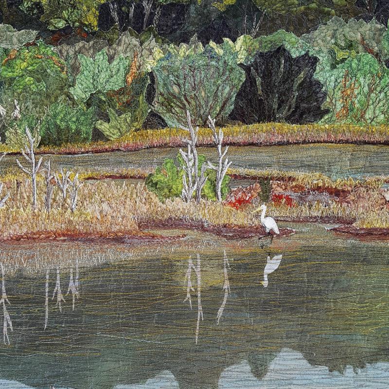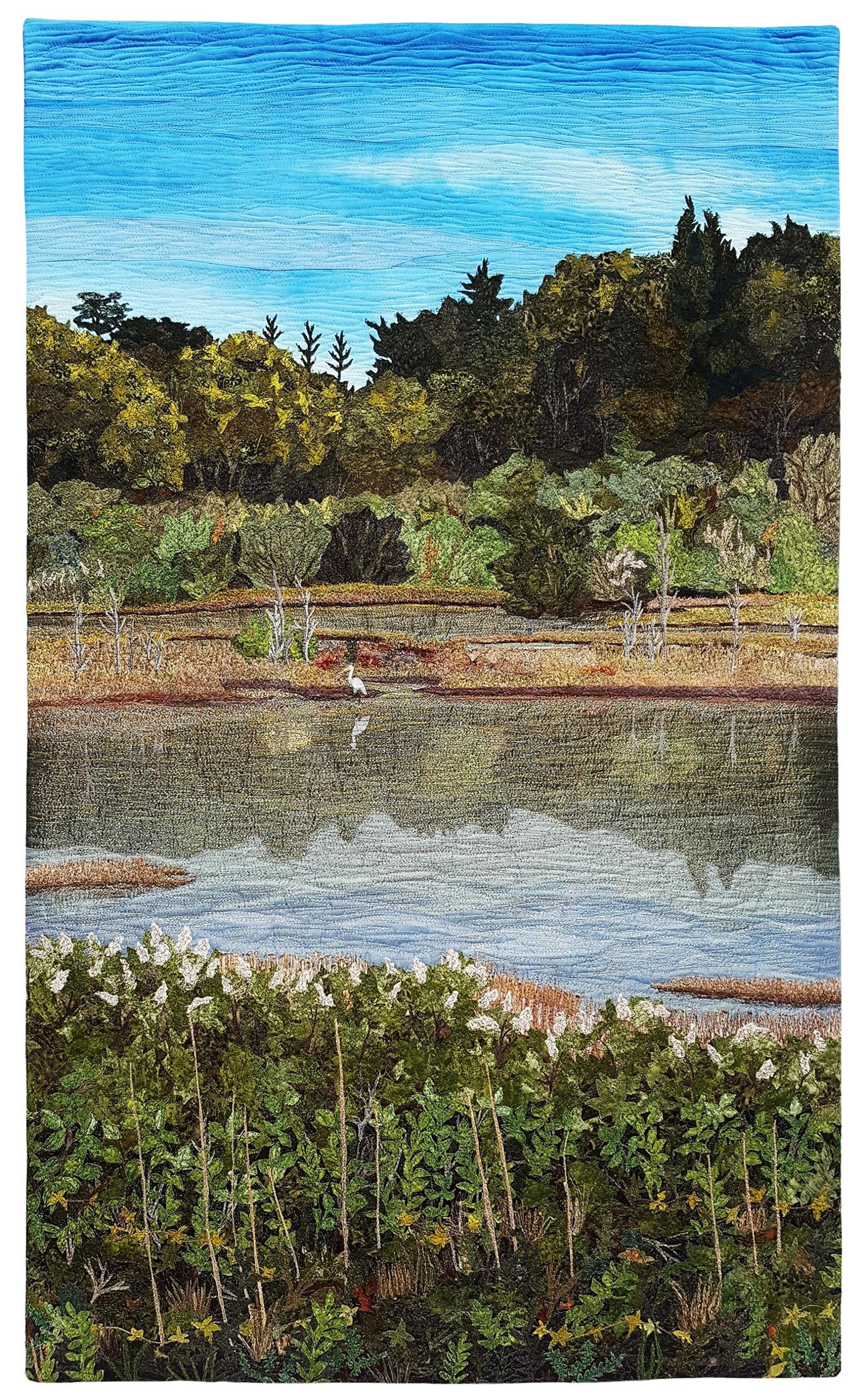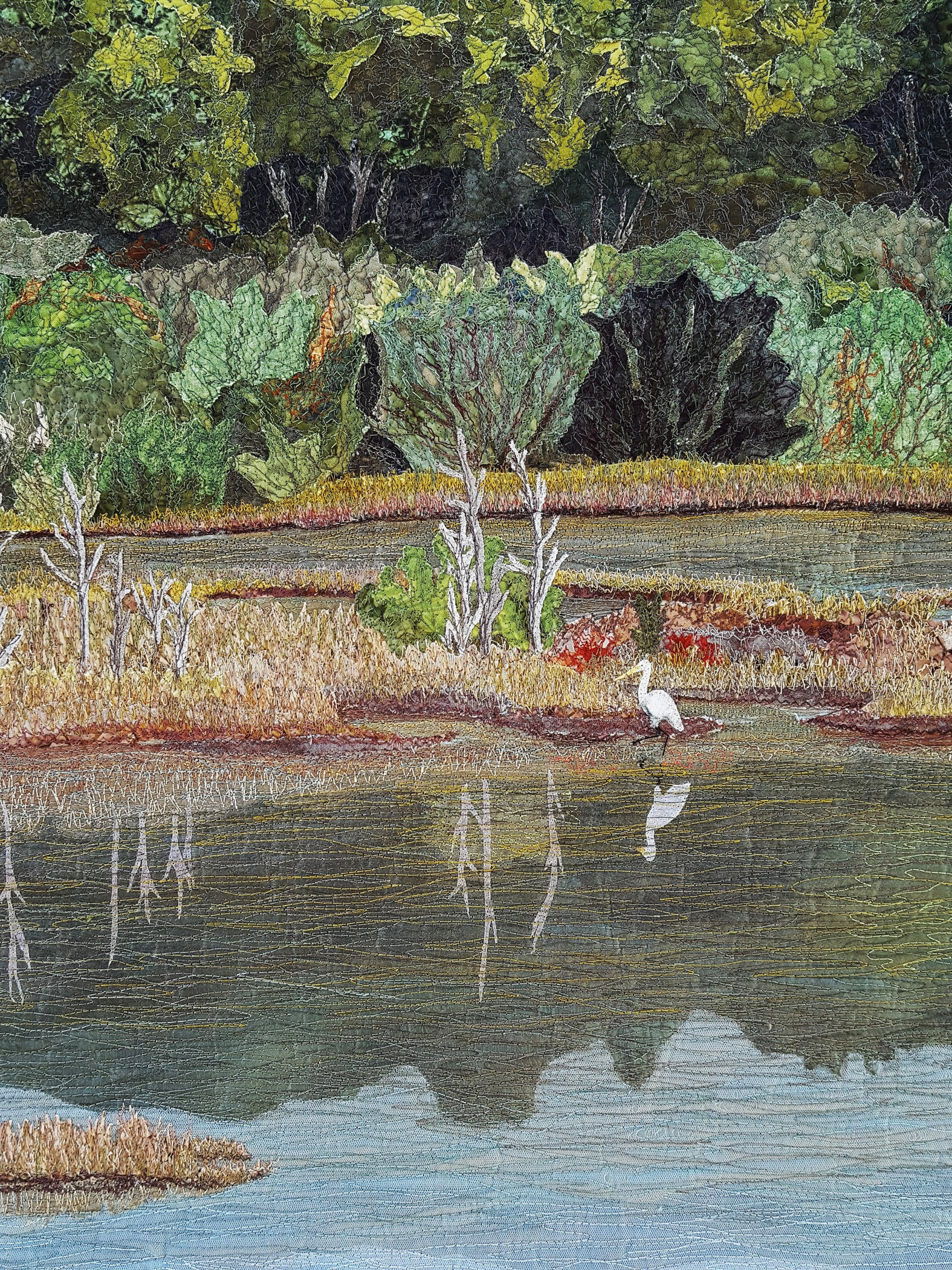 As I was admiring this scenic salt marsh in West Falmouth, MA, I noticed an egret watching me as he searched for his dinner. My eyes traveled around the setting, from the wealth of natural vegetation to the calm water decorated with reflections. I decided to construct all of these natural textures and illusions using fabric and thread - lots of thread!