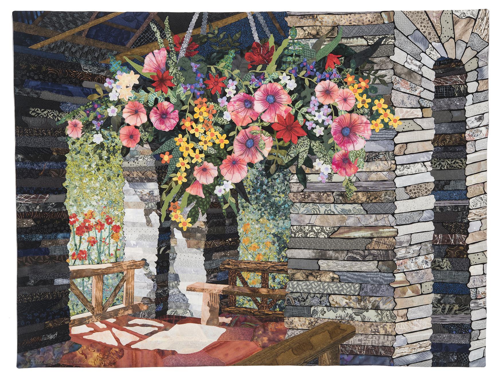 Scattered fabric (confetti); raw edge appliquéd, free-motion quilted