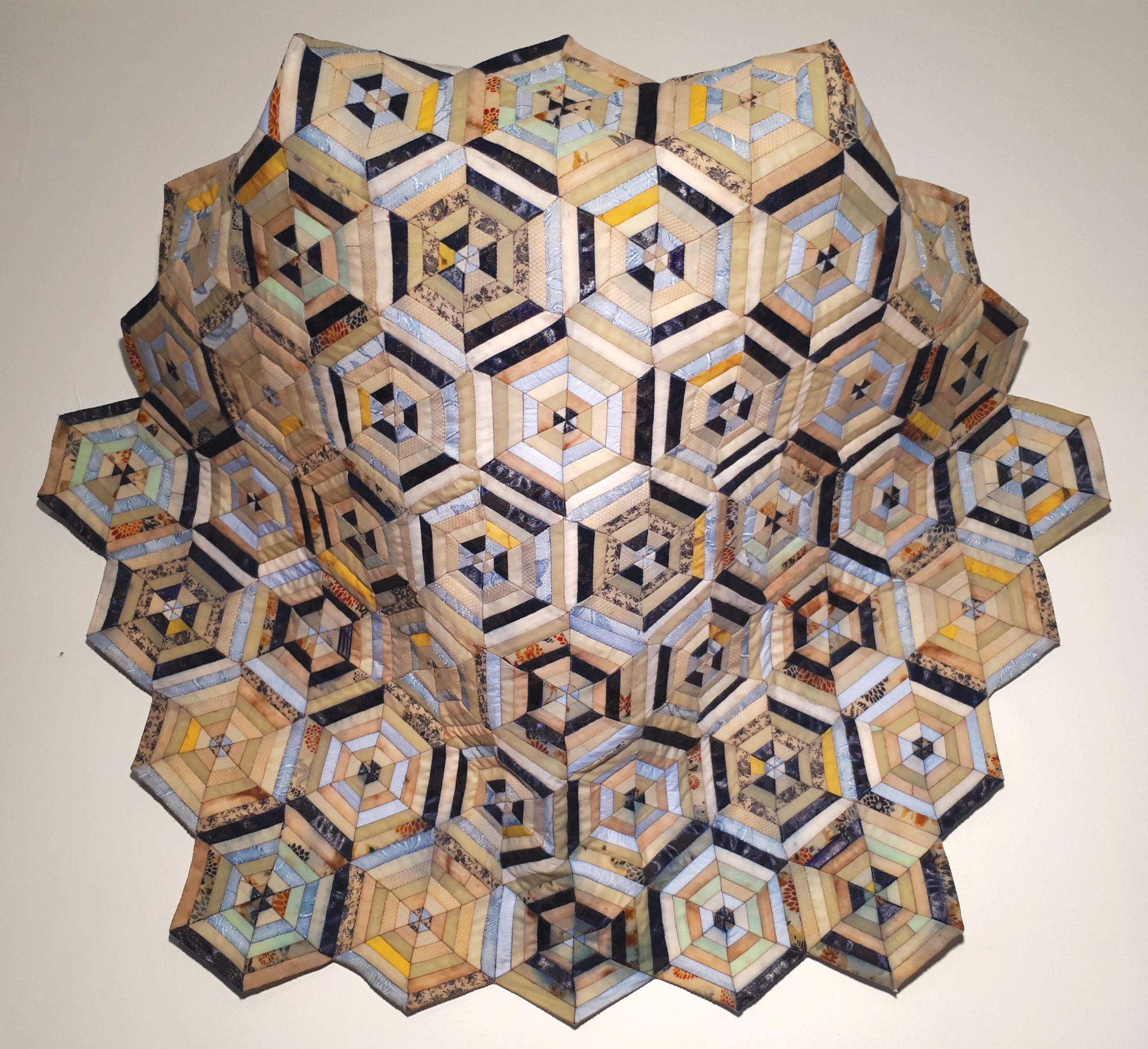 Sanguine means to be optimistic or hopeful, especially in a difficult or gloomy situation. This quilt focuses on materials that bleed into one another after oiling. I used Chinese and Indian silks sewn next to cotton.