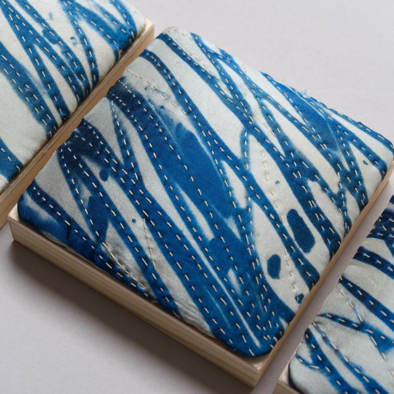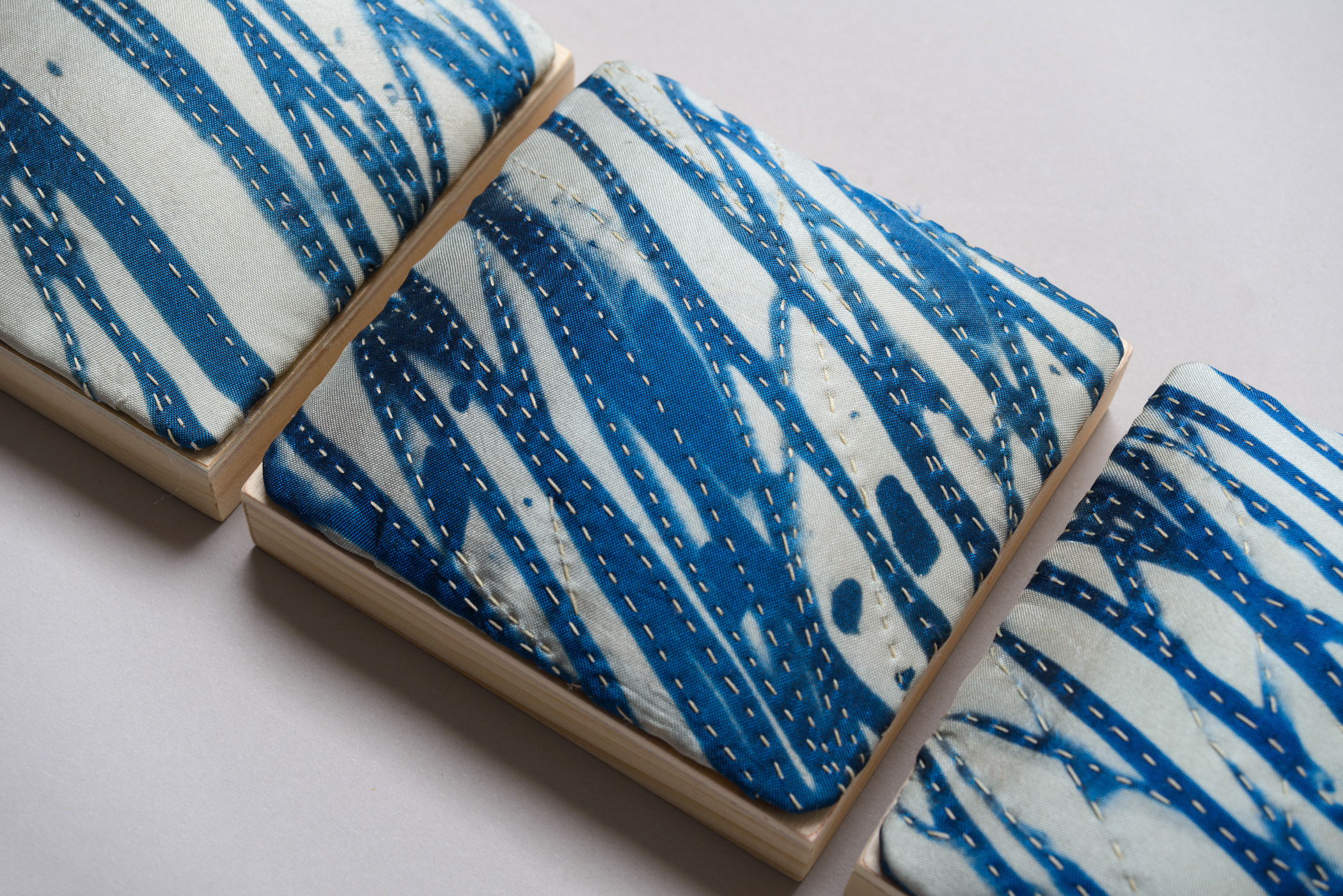 Hand-dyed silks, vintage cotton thread, batting, wooden canvases.