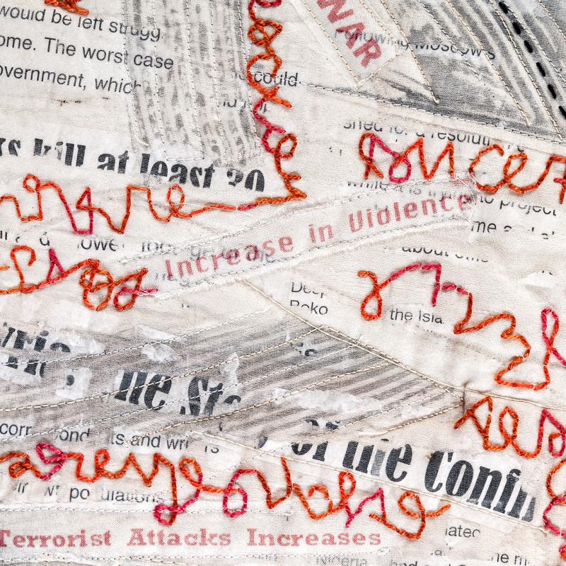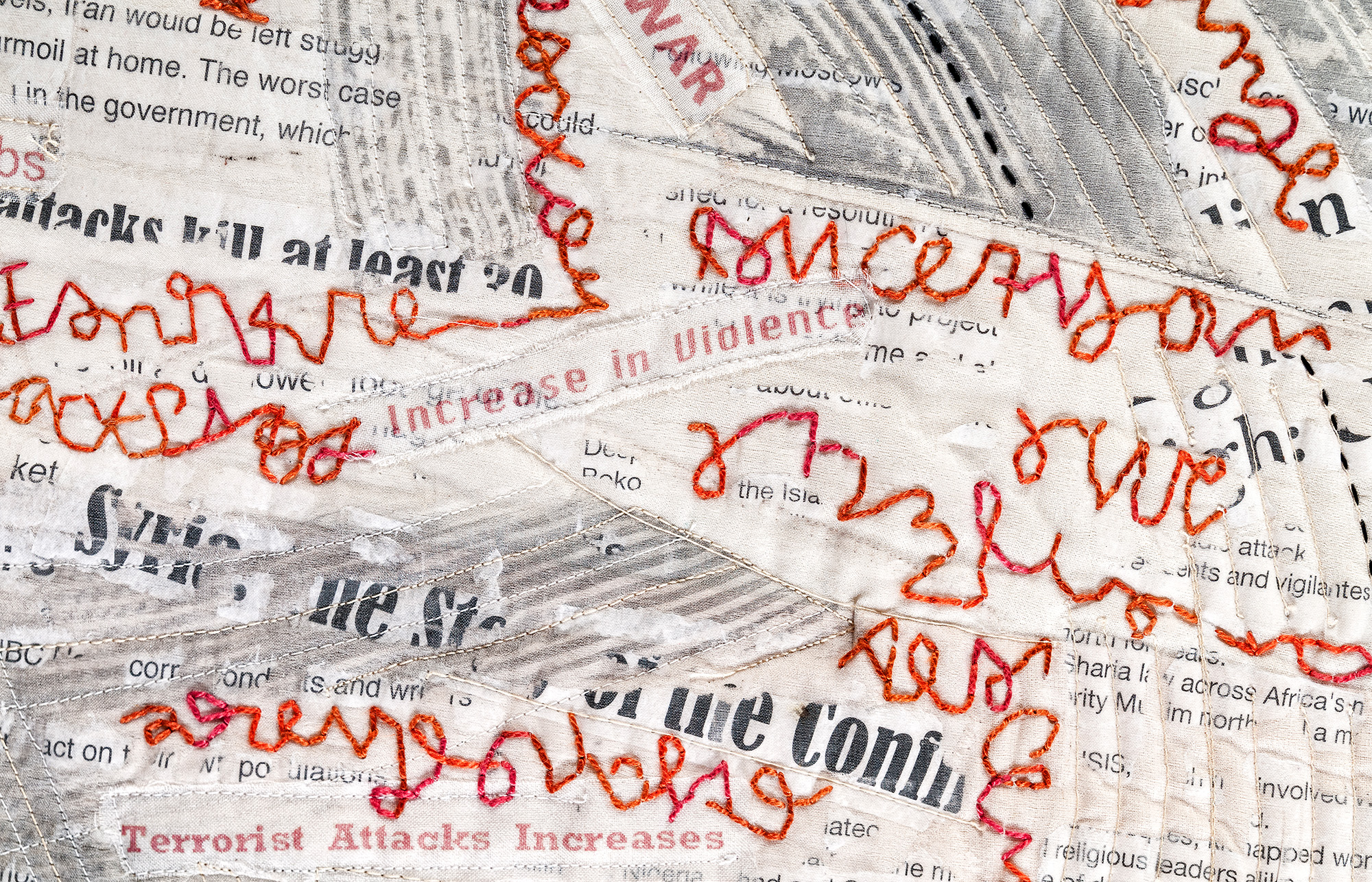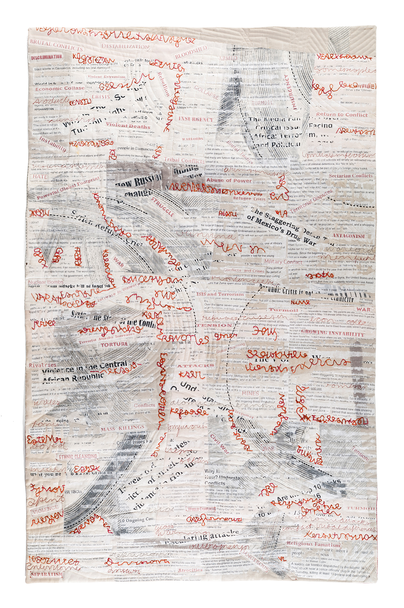 This art quilt is part of a series in which I use text as a form of mark making. In this piece I express the confusion created by the over-abundance of information.