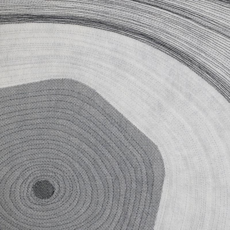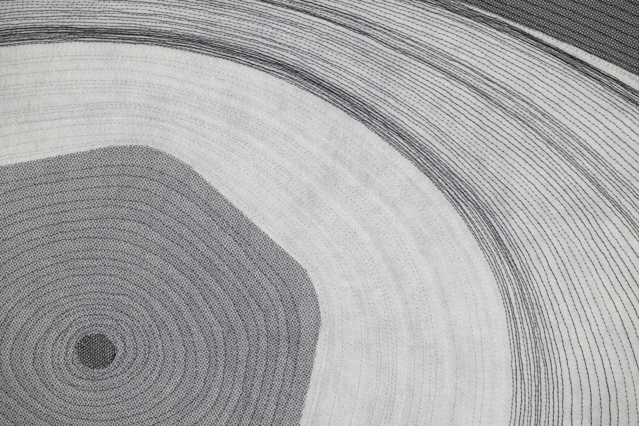 For more than a decade, NASA’s Cassini mission observed Saturn. With its atmosphere made up mostly of hydrogen and helium, Saturn does not have a solid surface like earth, although it may have a small, dense core of rocks and minerals. Cassini identified a hexagonal area on the north pole, which has been explained as a mega-storm of swirling gasses. To interpret this phenomenon, I have used non-bonded fabric to represent the gas enveloping the core. To convey its containment and ring markings, I have used net with continuous stitch lines.