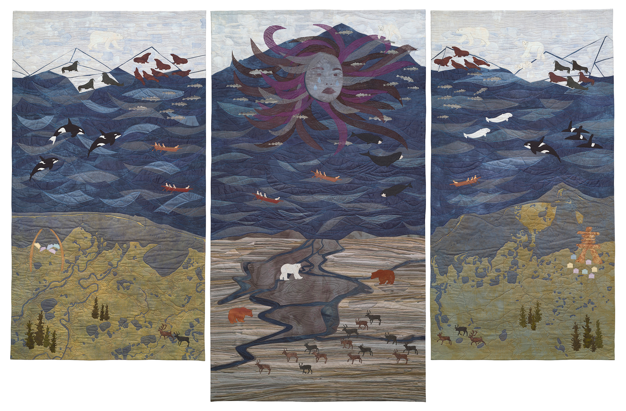 Sedna, sea goddess of the Inuit, cries for the progressing diaspora of her people. She sees their houses fall into the ocean. They move their villages, but the ice goes north, making them traverse wider, rougher seas to hunt. Orcas invade and disperse their traditional prey. The white bear comes ashore, hungry. The brown bear and the advancing forest confront him.