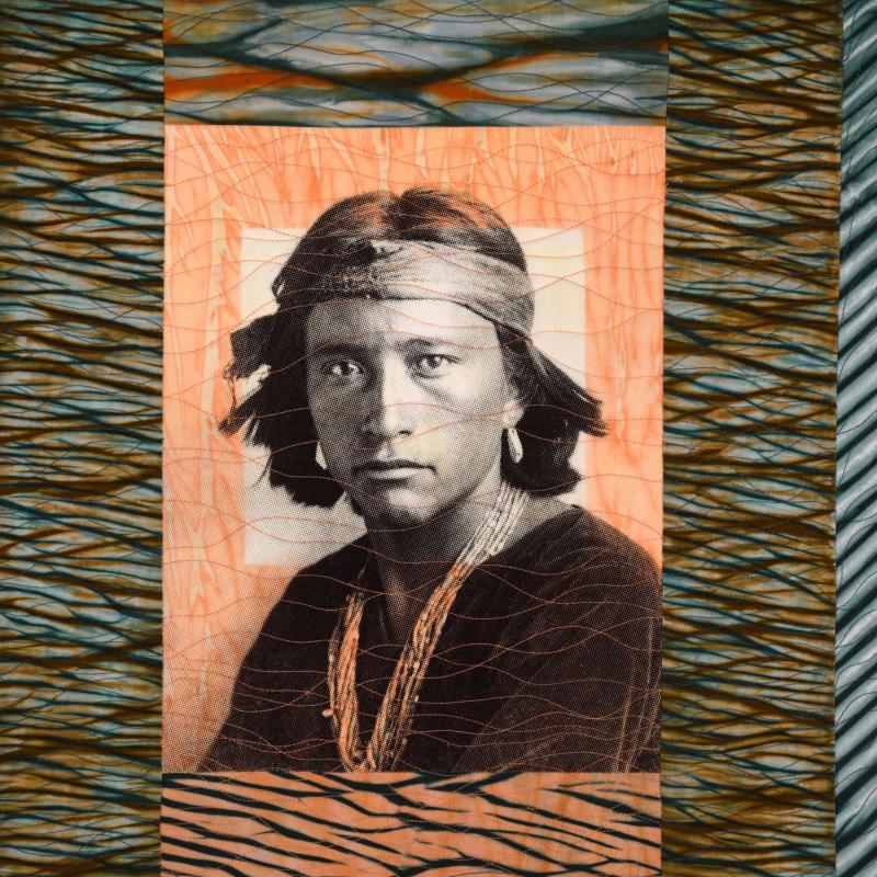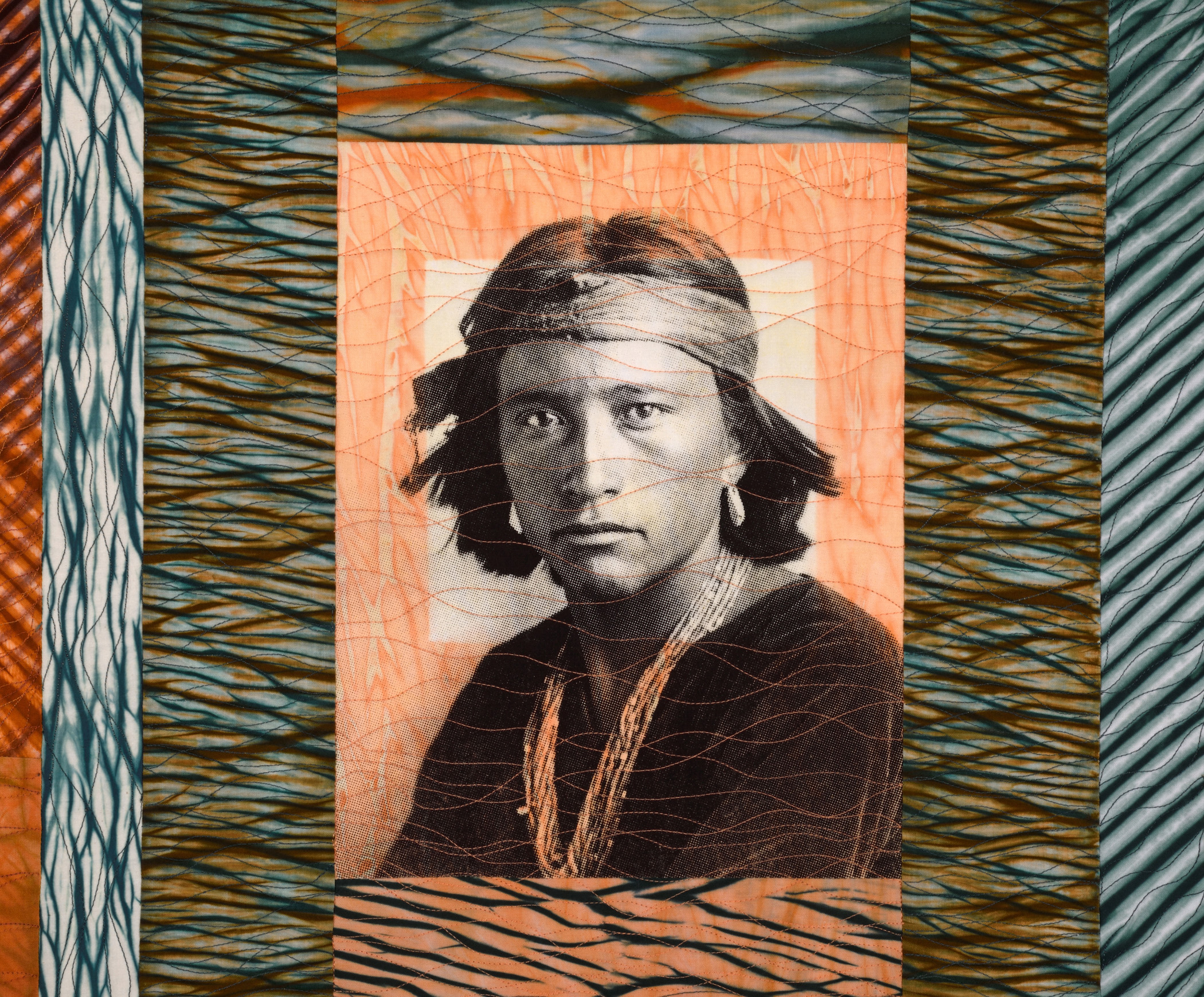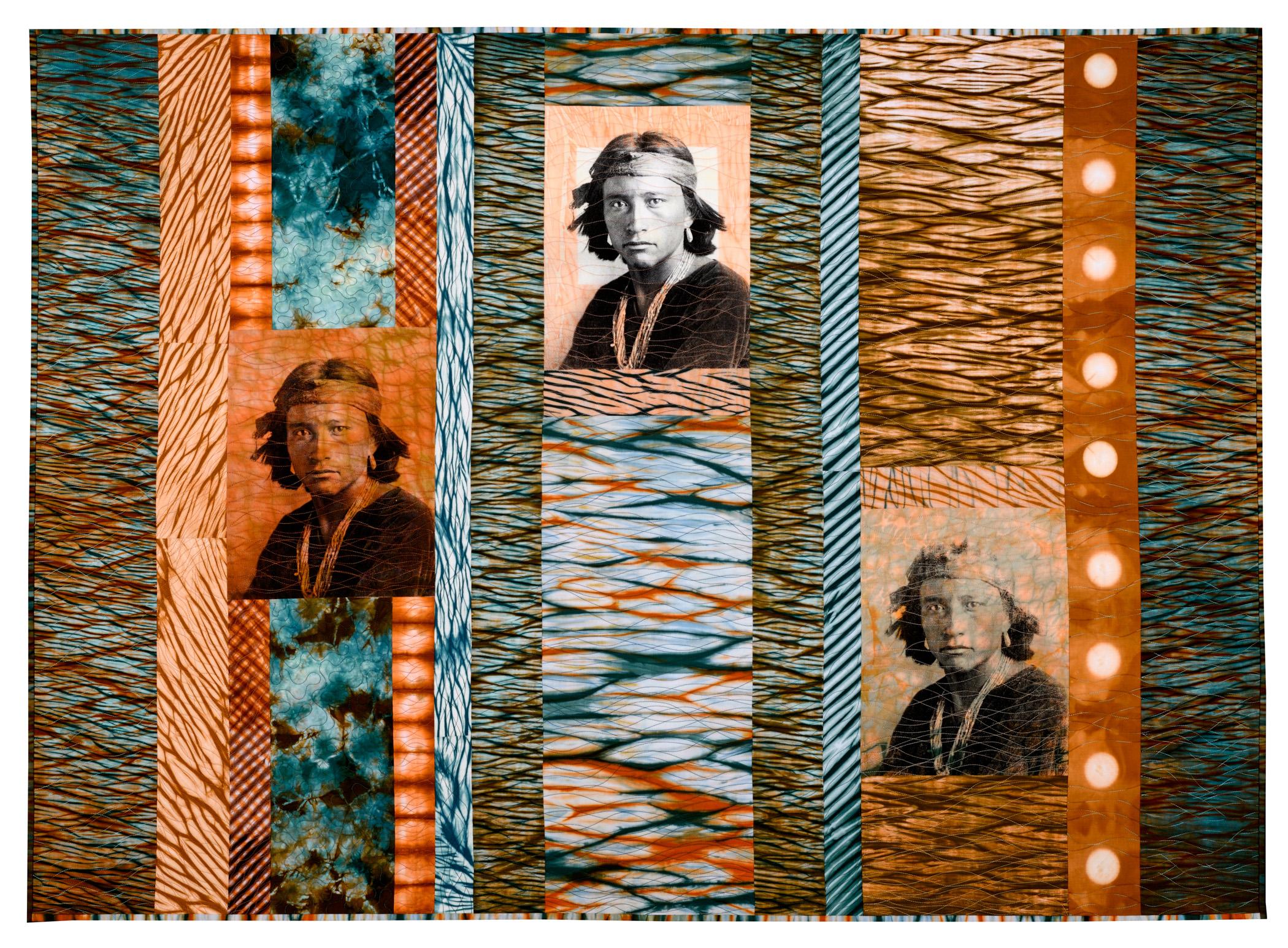 The earth, in tandem with the sun, creates a spectacular light show, presenting a constantly changing and unpredictable display at sunrise and sunset. Witnessing the changing positions of the sun during a visit to Sedona, Arizona was stunning, made even more impressive by the backdrop of rusty-red mountains and clay trails. Hidden in the sides of some of the red rocks are caves and cliff dwellings, inhabited by indigenous people centuries ago. Creating that memory in cloth, print, and stitch was the challenge undertaken with this piece, which hopefully reflects in some small way the magic, beauty, and mystery of that place and time.