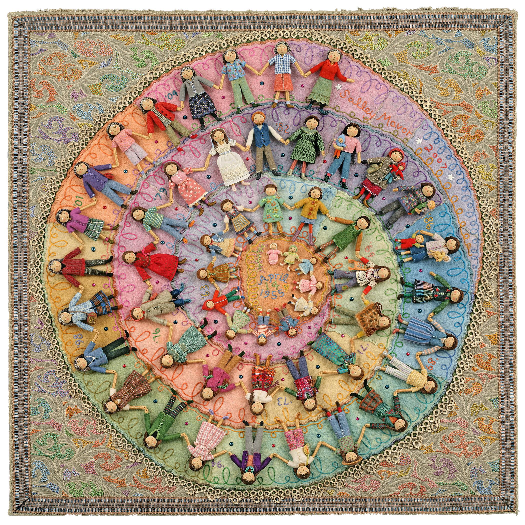 I started making the youngest dolls first, gauging the size increase as each year passed. The dolls' armatures are made from thread wrapped pipe cleaners, with each figure dressed in an outfit I would have worn that year, taken from memories, family photos or imagination. Since I've sewn many of own clothes in my life, it was easier to remember an outfit from the past. They are recreated here with smaller scale fabric and embroidered wool felt. The wooden bead faces are painted and glued onto the pipe cleaner neck. The hair is made from embroidery floss sewn to a felt "wig" that is glued to the bead head. I showed the evolution of my hair graying, with strands of white intermingling with the dark brown thread. My husband appears the year we were married and my sons are included through the years when they were little and physically connected to me. The tatting outside of the circle was made by my grandmother about 100 years ago. The wool felt spiral is mounted on upholstery fabric, which I embellished with multicolored French knots.
