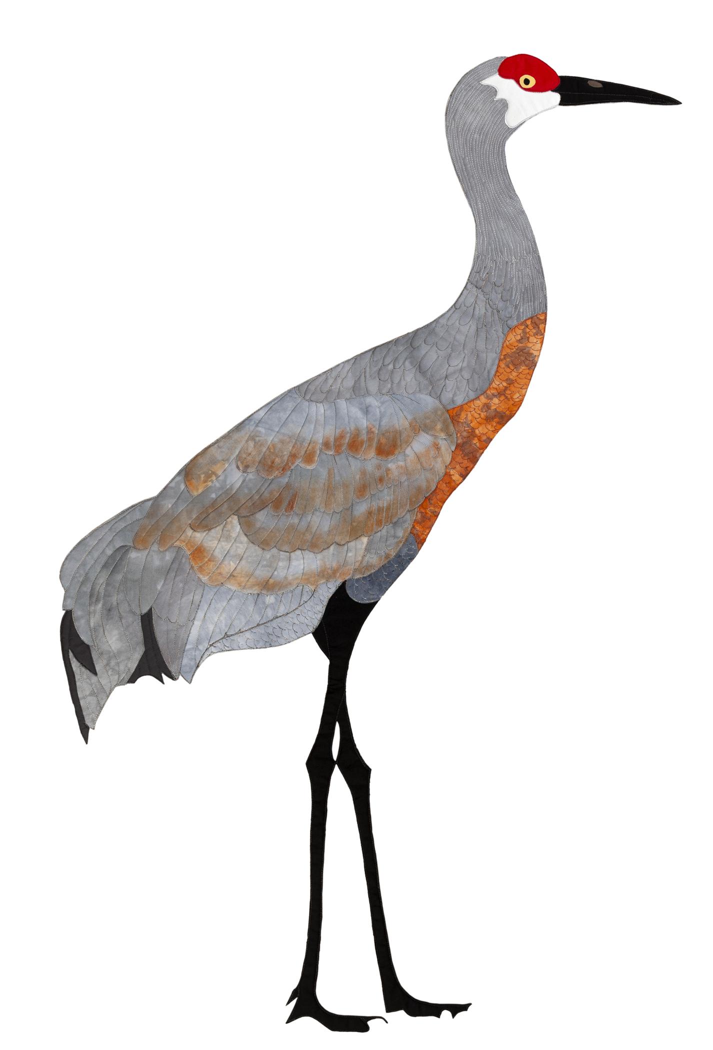 Sentinel is part of a site specific installation titled Migration which will be on view in the Parker Gallery, Oceanside Museum of Art, opening in September 2021. The installation will include several nearly life size sandhill crane quilts similar to Sentinel and suspended textile clouds.