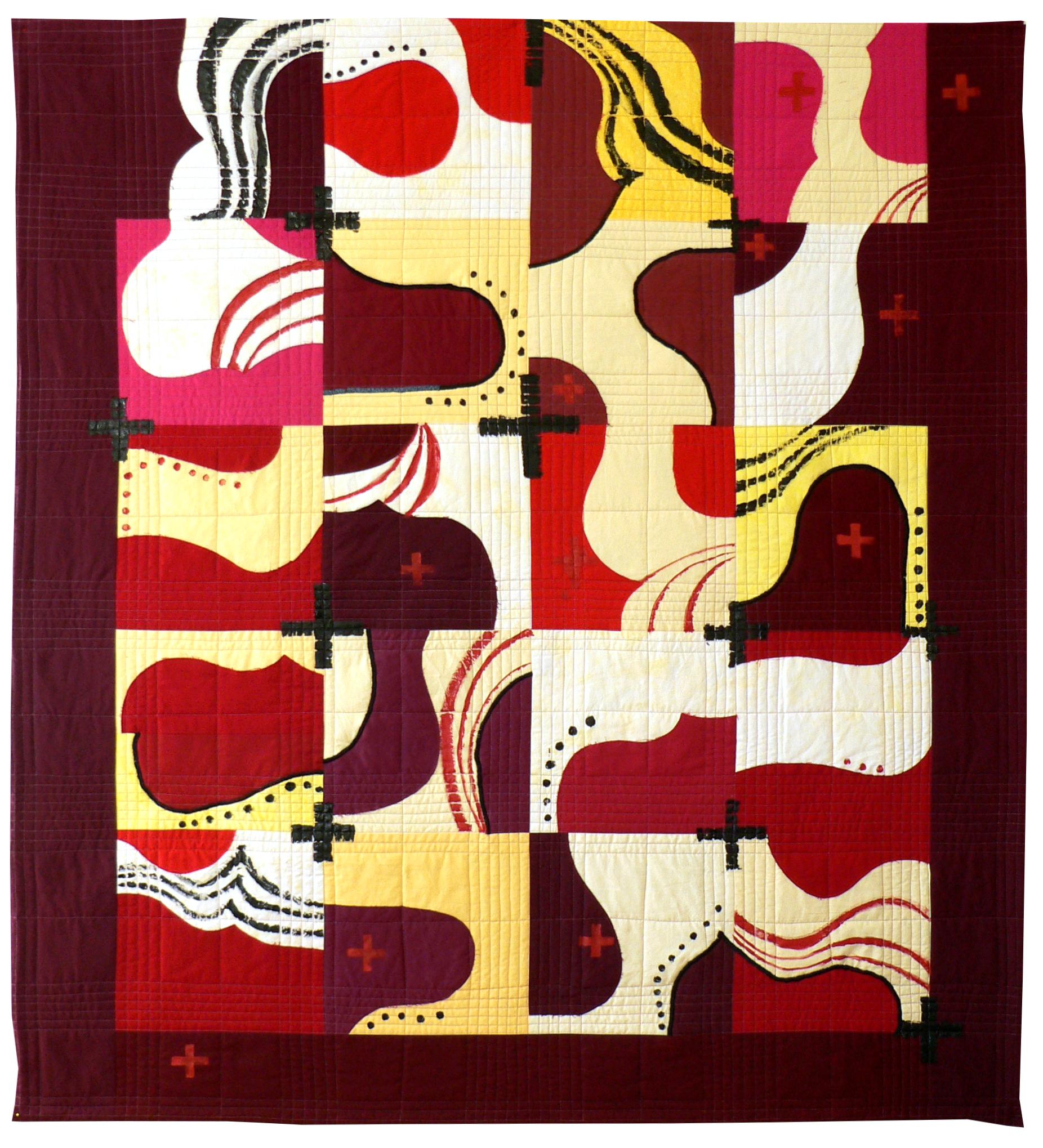 Cut, appliquéd, machine pieced and quilted, hand painted, stamped