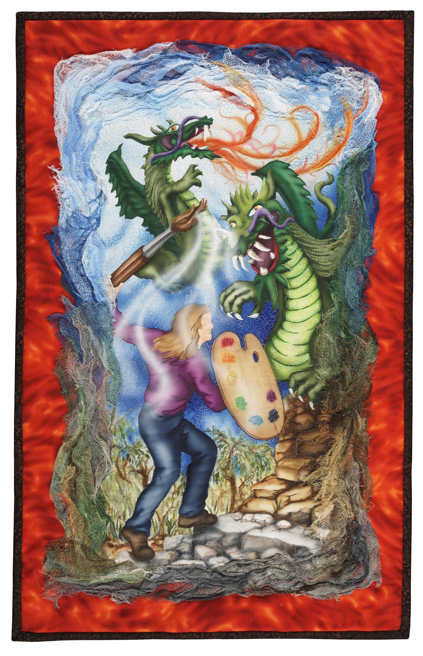 Bravely facing an ambush while trekking on The Creative Pathway, Our Heroine brandishes her trusty lance in preparation for colorful engagement with the meddlesome Demons of Insecurity Hill.