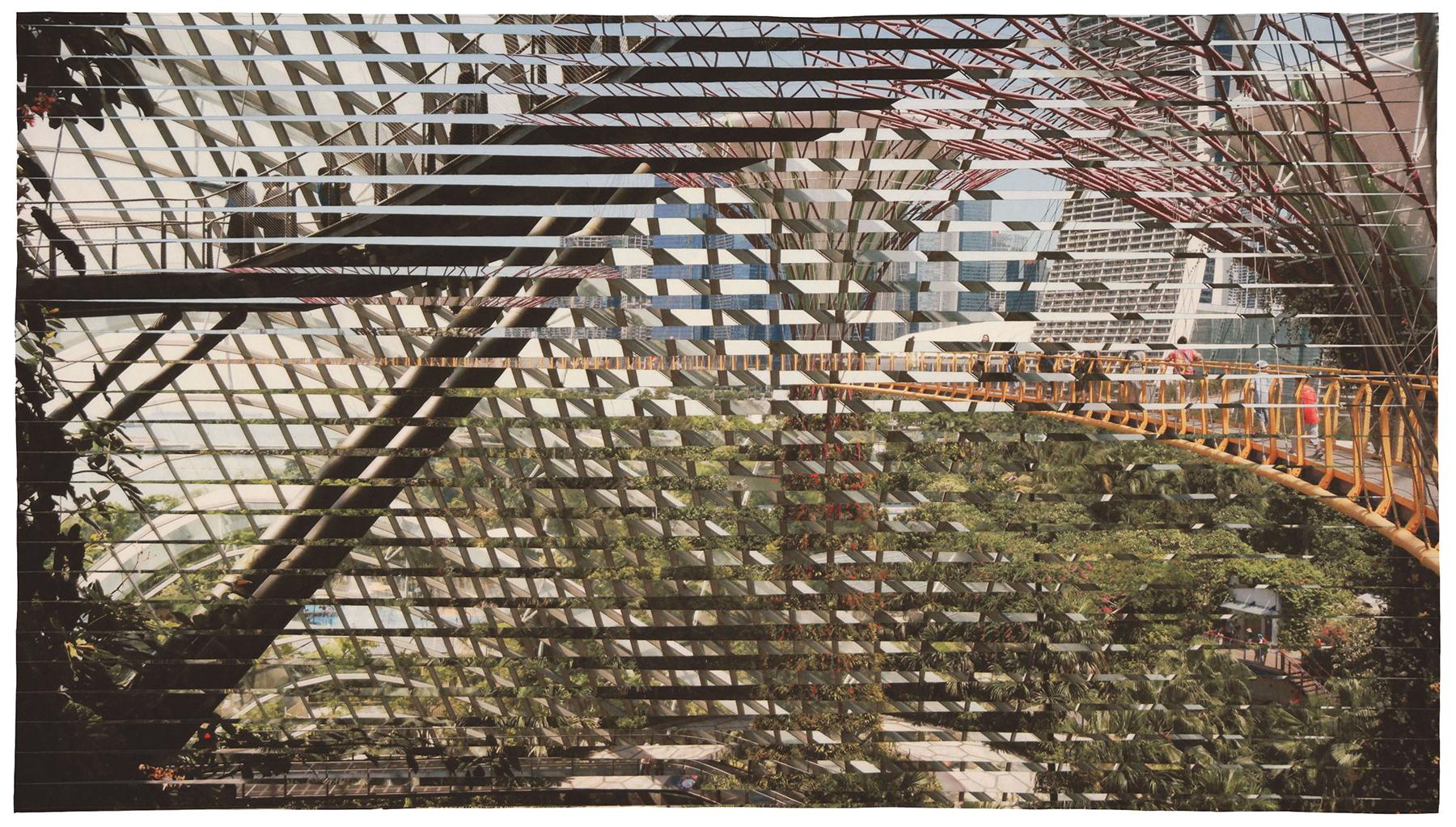 This piece was inspired by two photographs I took in Singapore. An image inside a dome greenhouse blends into an image outside the greenhouse. Both people and plants are “aloft.” I was fascinated by the curved lines provided by the elevated walkways, soaring trellises, and curved building.