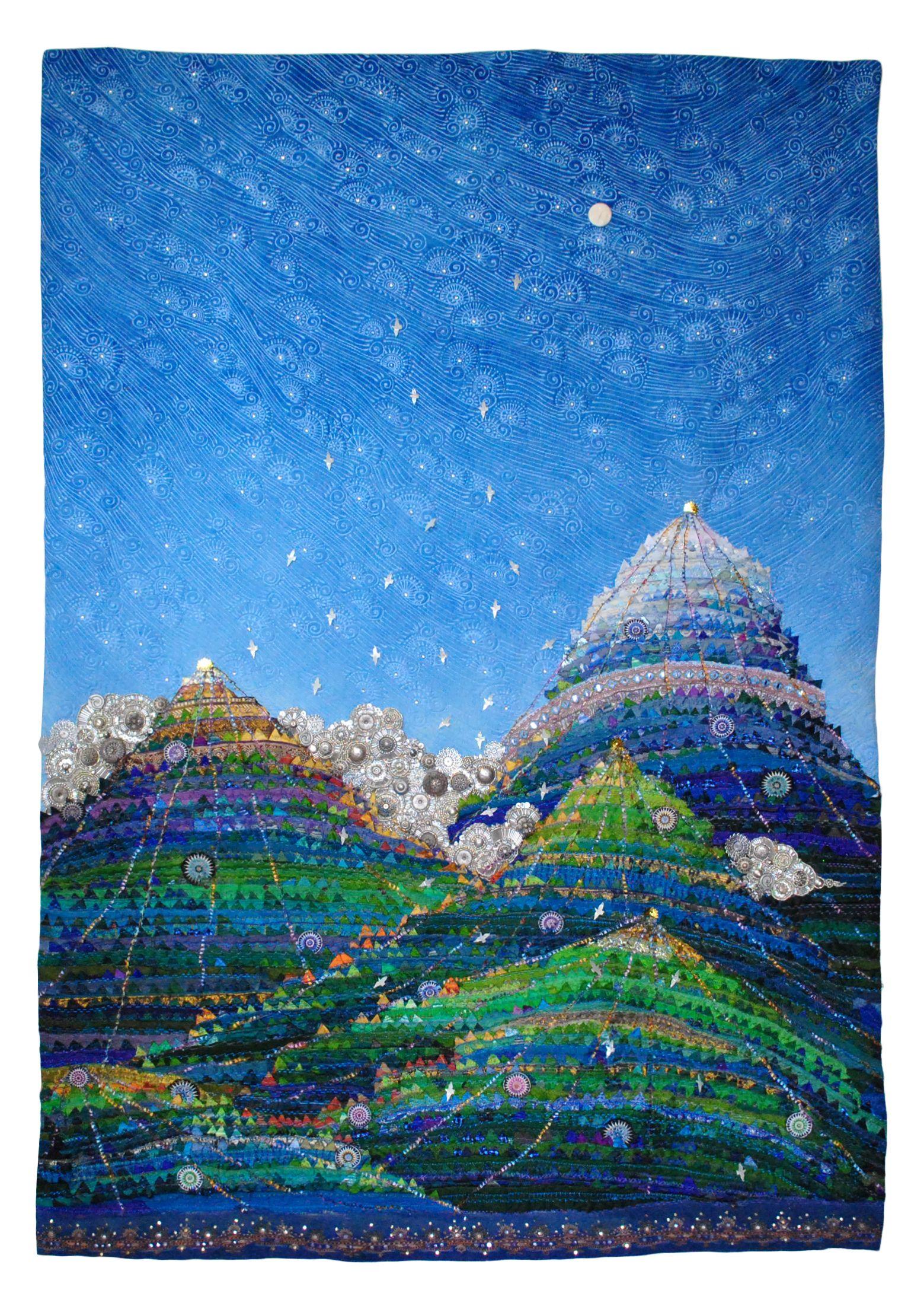 This piece was inspired by the people from Tibet now living in exile. Home to them is a distant memory. Many have fled this country of high clouds and mountains, their home on the roof of the world. This piece is a mind’s eye view of a remembered home. It recalls a memory of the light on the mountains, the feel of the wind, a perception of the sky. This is a life holding onto remembered moments and a feeling deep inside of home.