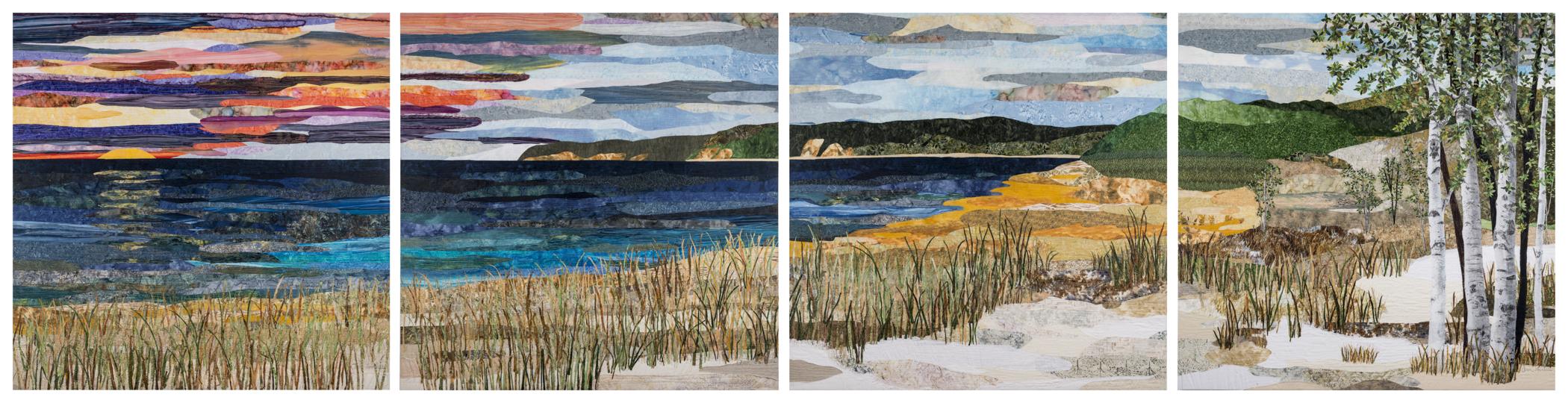 Working from a panoramic photograph I created a Northern Michigan lake scene using my "collage" quilting technique. I challenged myself to work very large. I split the scene into four manageable panels but when hung together created an amazing 20 foot scene. My collage technique includes batik and cotton printed fabrics along with linen, yarn, sheers, silk, photo transfer elements to achieve interesting textures. I am an artist who has not only exhibited in quilt festivals but have ventured into art exhibits and have had tremendous success. Many times I am the only textile piece to enter an art show and I have found generally that the public is unaware of art quilts. Sleeping Bear Dune Lakeshore won first place peoples choice award in 2013 Grand Rapids, Michigan ArtPrize art competition with a cash prize of $200,000. With this art award I have brought tremendous awareness to the art quilt movement. With my successful art quilt career I have built a beautiful studio, purchased latest machines and have a full time career earning a good living by being a textile artist. Winning this award has opened up many new opportunities which include authoring a book, lecturing and teaching nationally and many more exhibit opportunities.