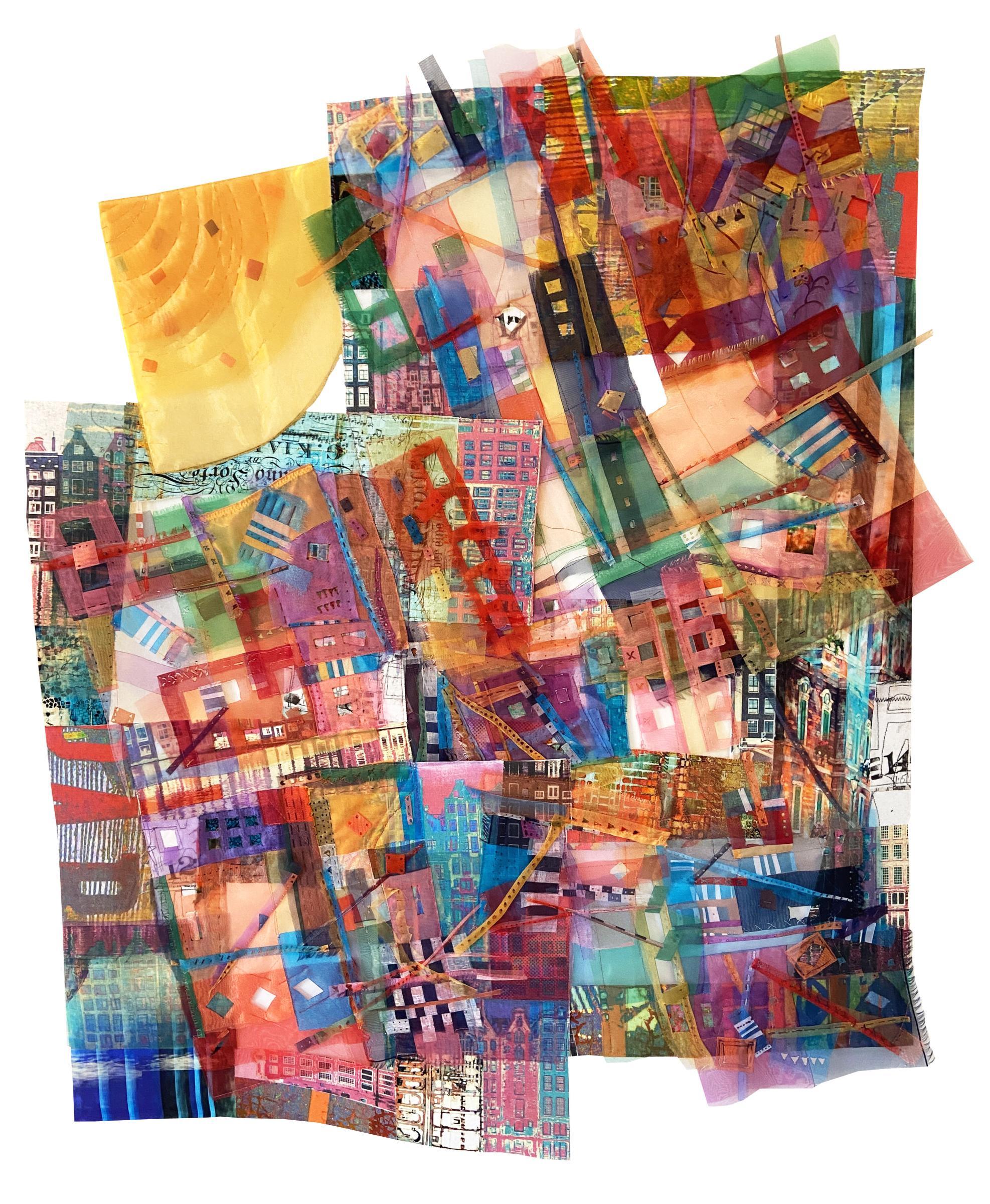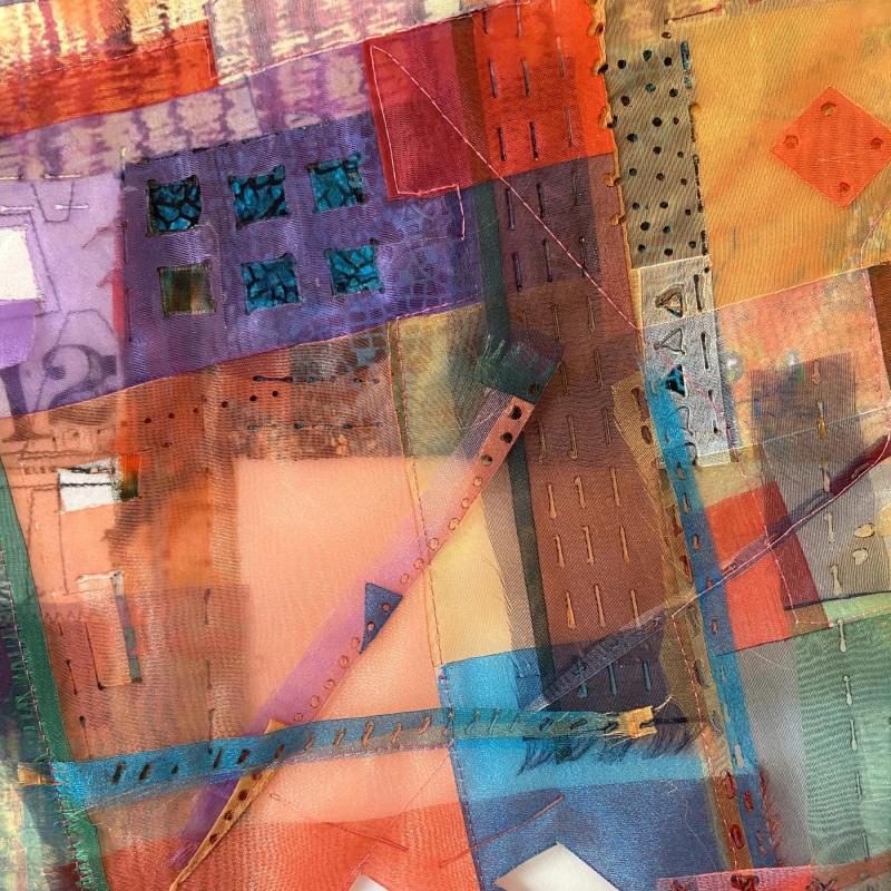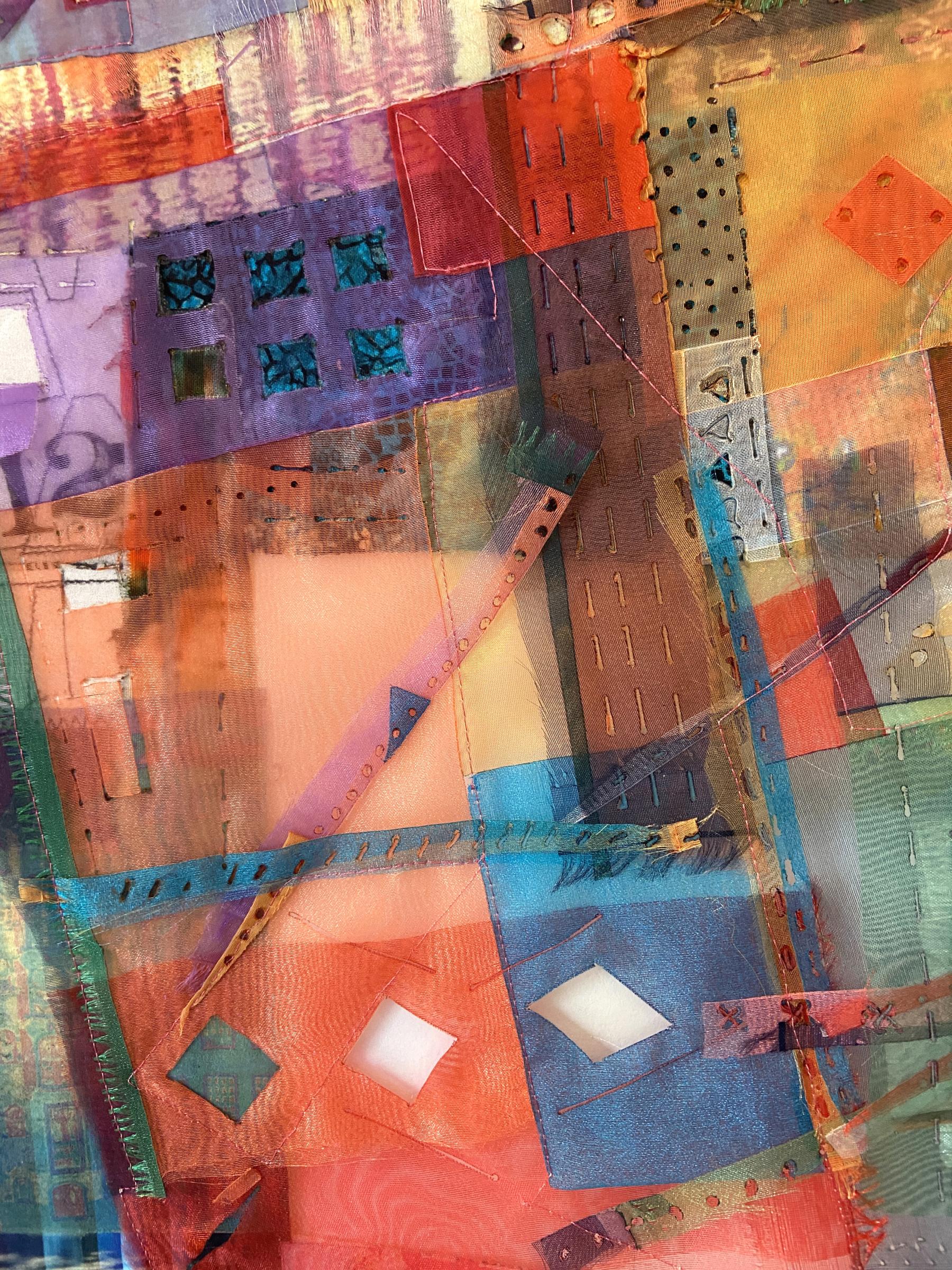 Photo transferred, fused, cut and assembled with a soldering iron, free motion quilted