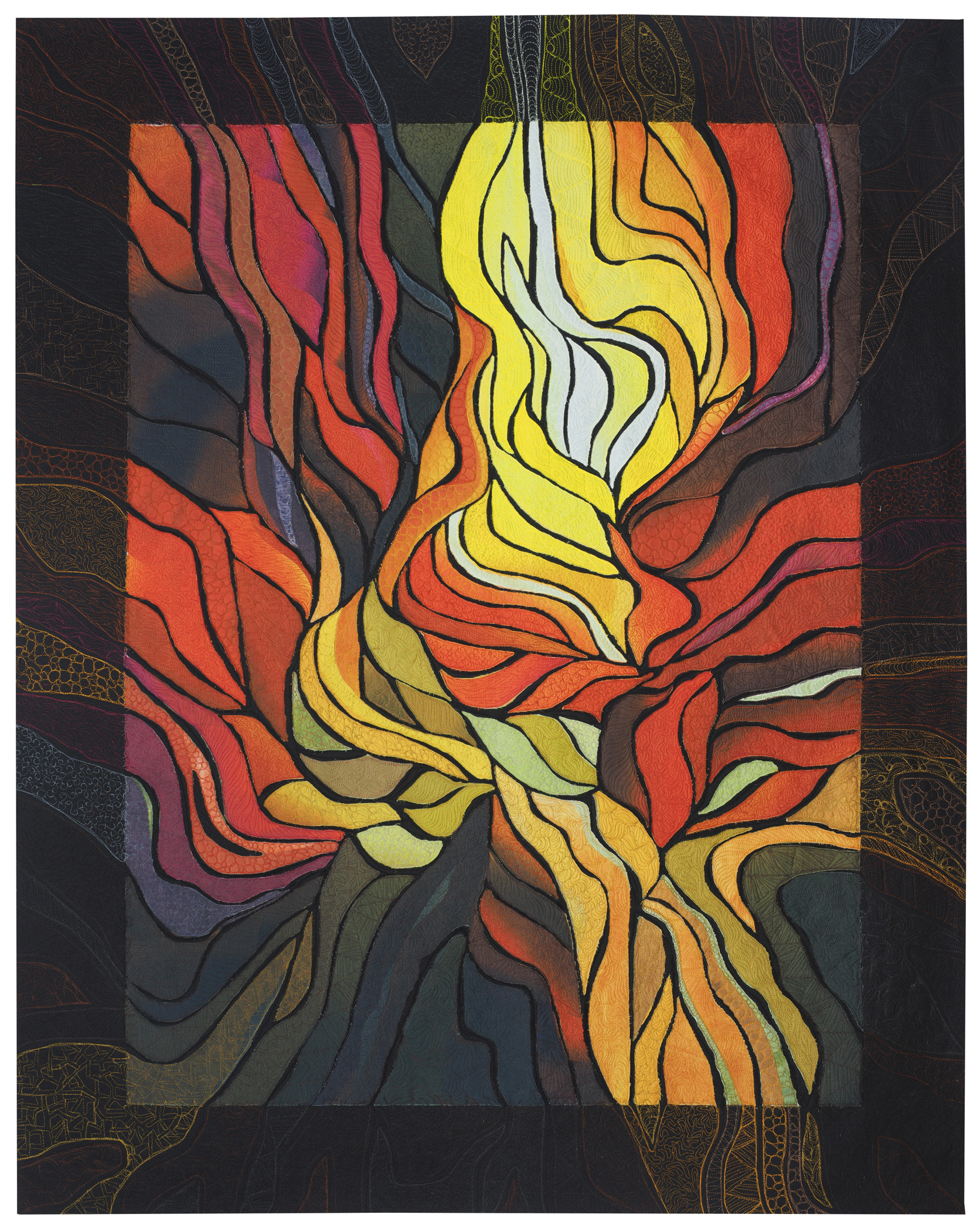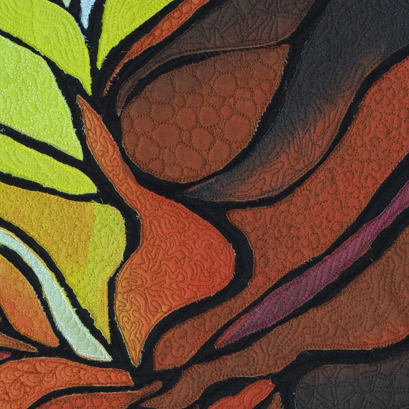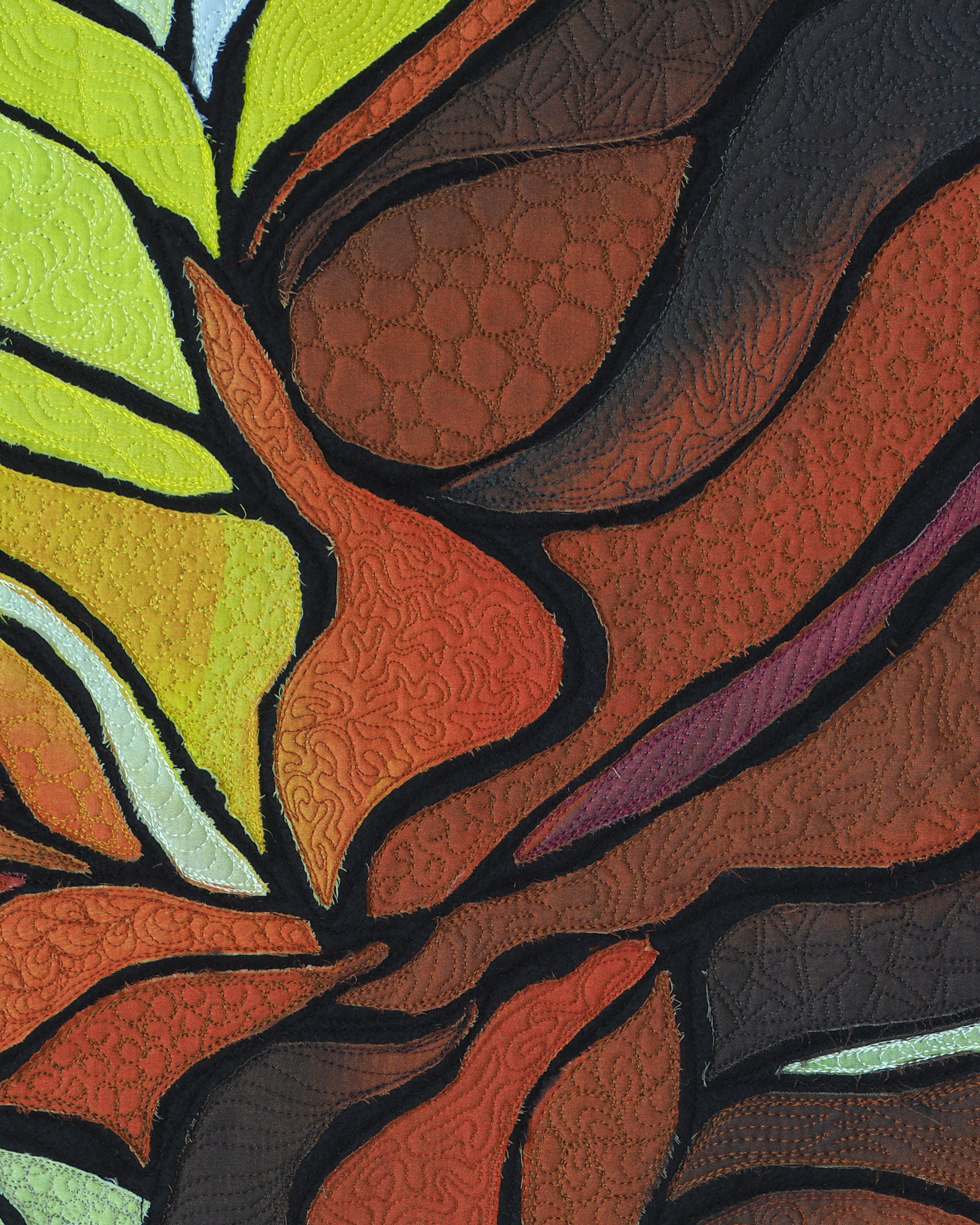 Digitally designed and printed, raw-edge reverse appliquéd, free motion quilted