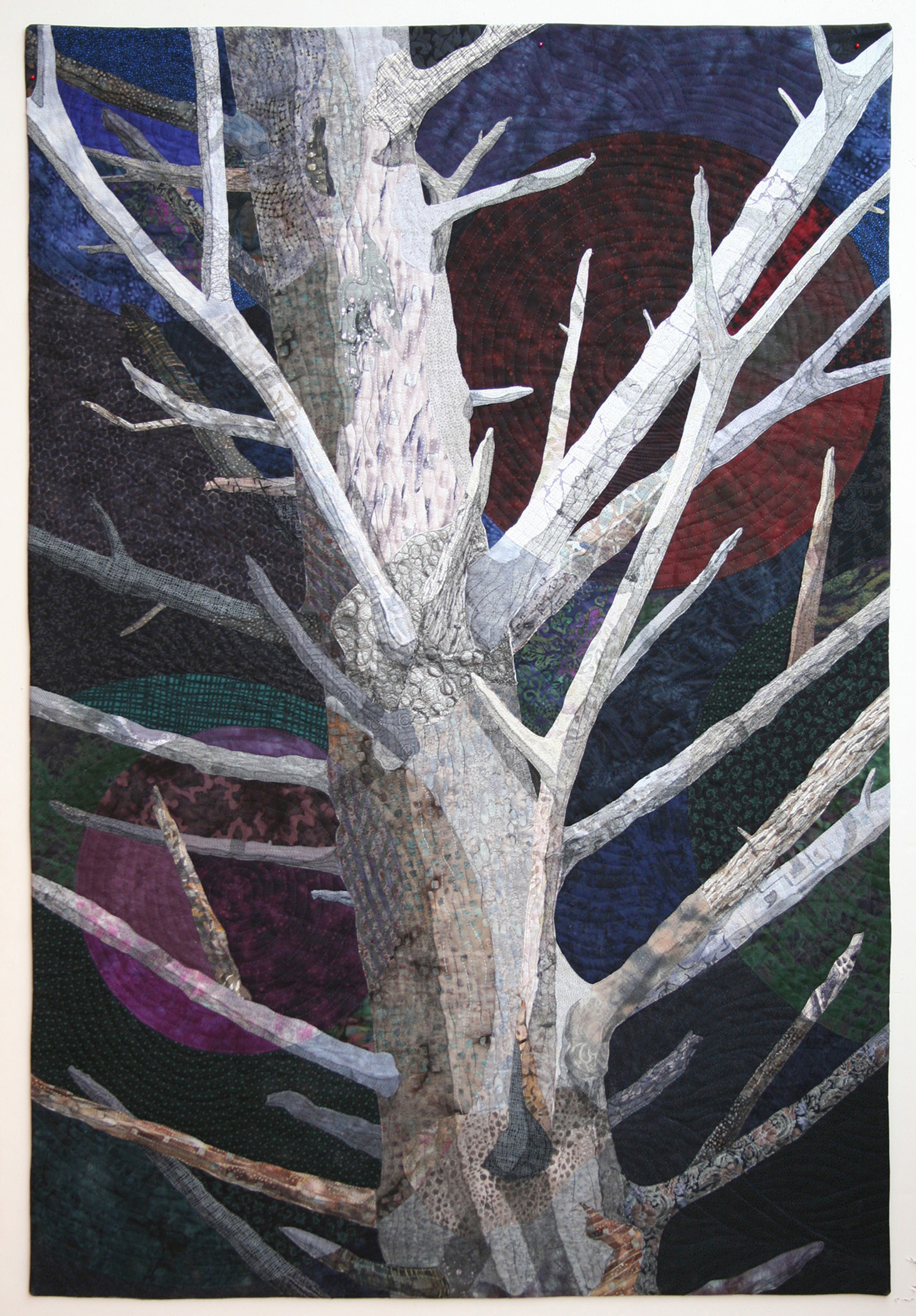 My fascination with these trees is the silhouette of the white barren trees in the front, against the dark forest background and my feeling of total vulnerability in this place. I am attracted to this high value contrast and the patterns of the tree shapes, textures, and neutral colors. One of my tree quilts, "Sentinels," was juried into the Visions 2012: Brainstorms show that was in San Diego. The quilt I am entering here, "Solitude," returns to the circular theme of my earlier quilts on the Rialto trees.