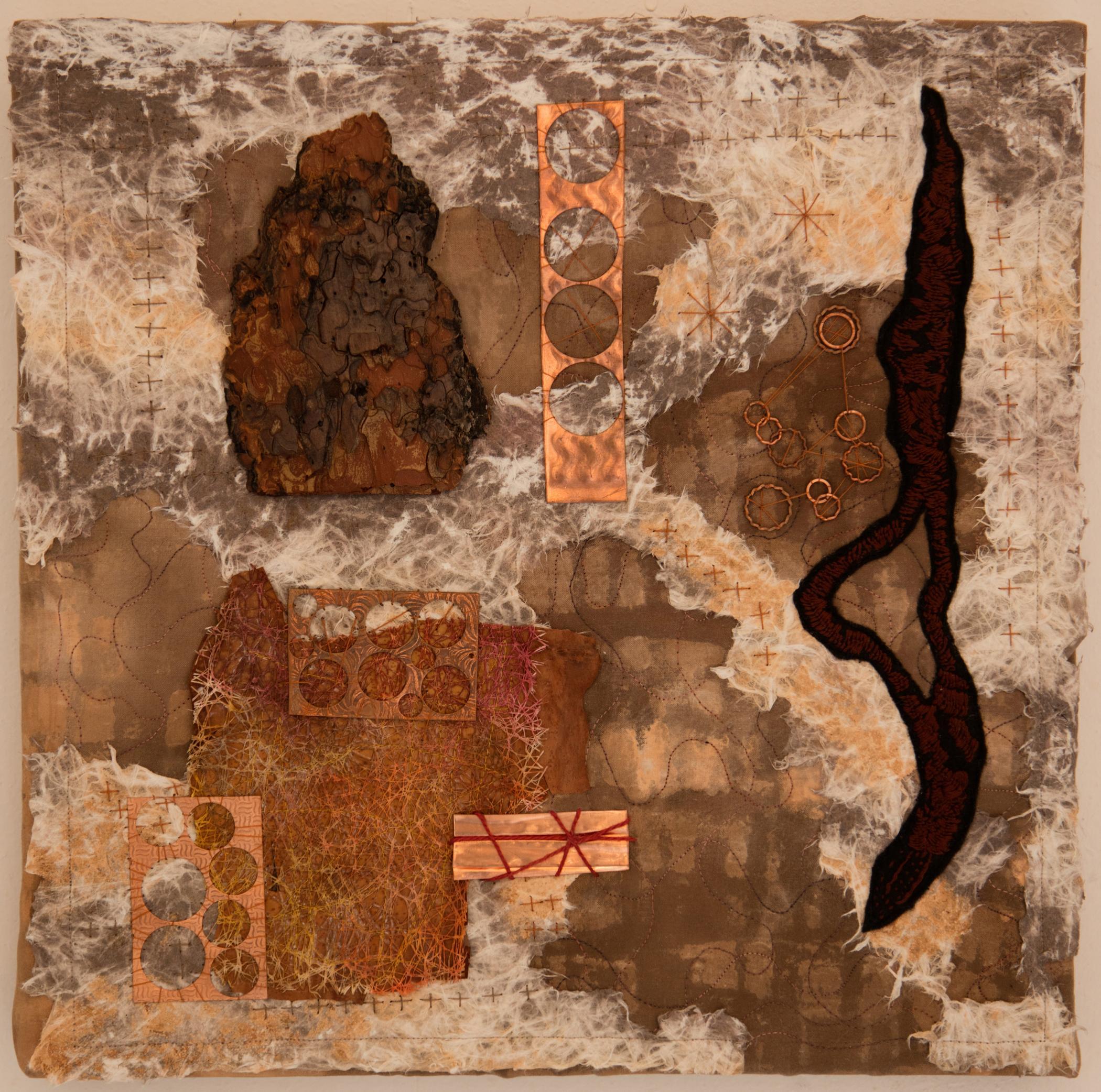 Paint on cloth soaks color into soft paper, creating window-like patterns. Sinuous embroidery mimics growth. Pine bark flaunts a rigid structure, while maple bark settles softly on the surface. Copper gleams and clings with hand-sewn marks. A collage is made.