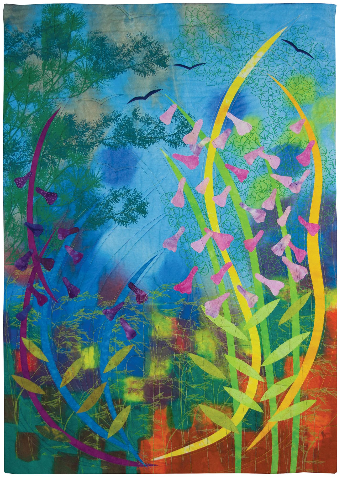 Painted, screen-printed, fused, machine appliquéd, machine quilted