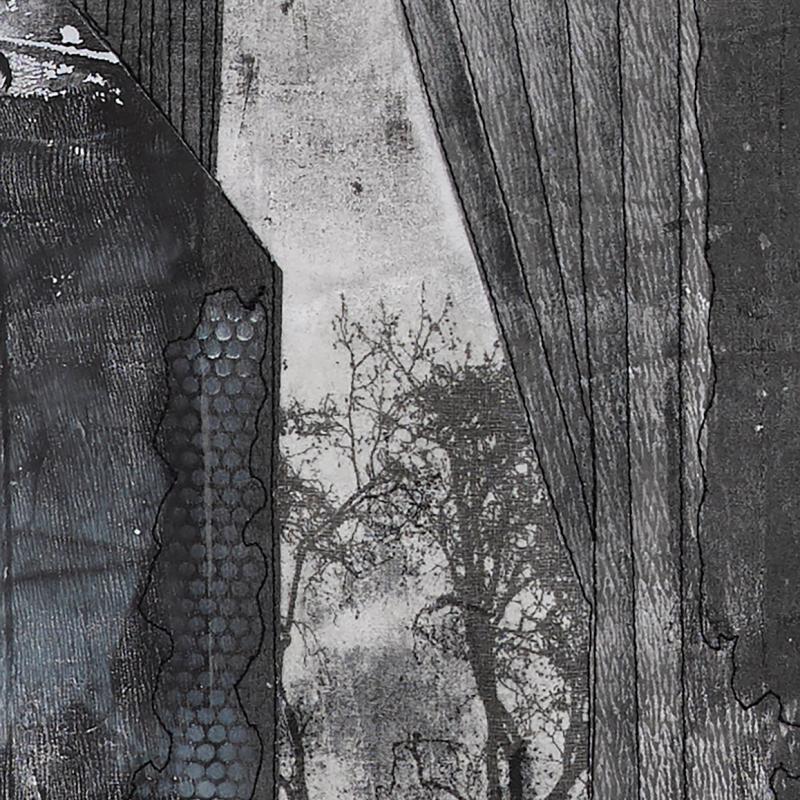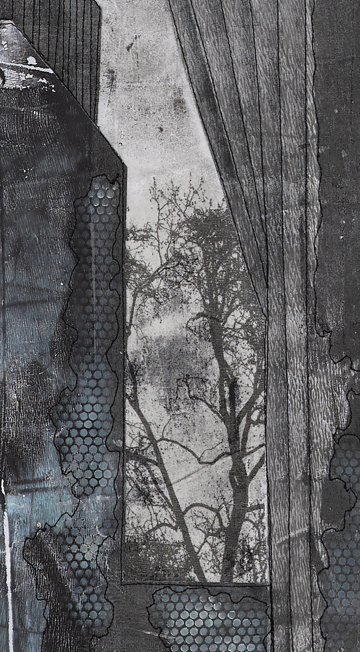 Photographs printed on organza, mono printed fabrics collaged with raw edge appliqué, colours heightened and texture depicted with Markal Paintstiks, rusty metal nuts used as spacers.