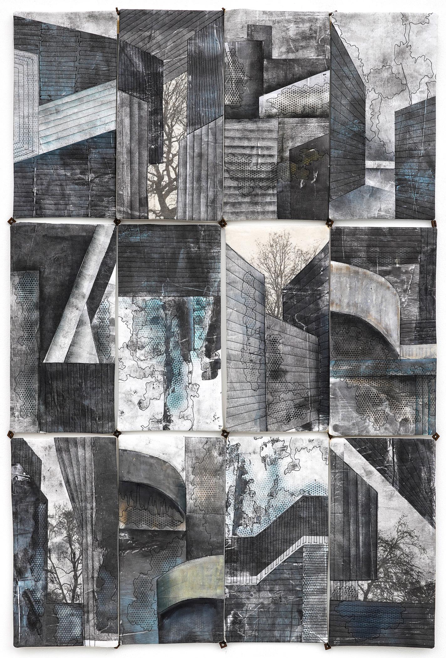 The concrete brutalist architecture of London's Southbank Centre is interpreted in 12 small quilts designed to be displayed as one. My textiles reflect the lines, shapes, textures and state of wear of the buildings - the discolouration, water marks, crumbling concrete and weeds sprouting up in cracks. The pieces focus on the abstract lines of the structures while conveying mass, space and light.