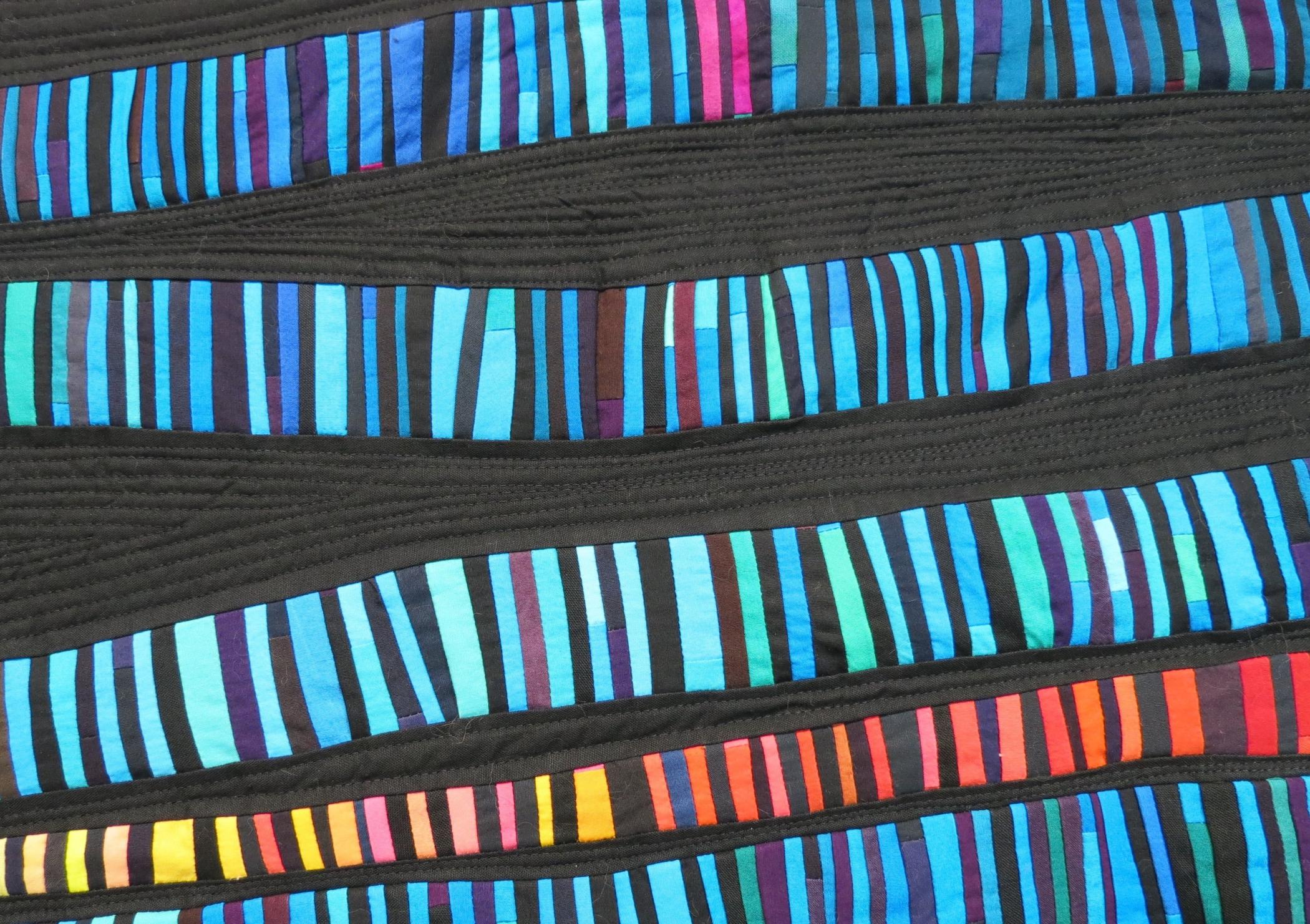 My passions for intricate piecing and organic textures and forms result in ever-unfolding visual imagery. In “Spectrums 2 - Blue Lines” I wanted to explore both the simplicity and the complexity that are possible using stripes and lines. It is constructed from solid-colored scraps. I first created 11 long strips, each a different value of blue and then strip-pieced these with solid black. Lines were then cut from each strip-set and combined to form gradations.