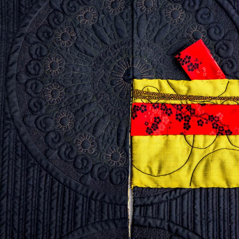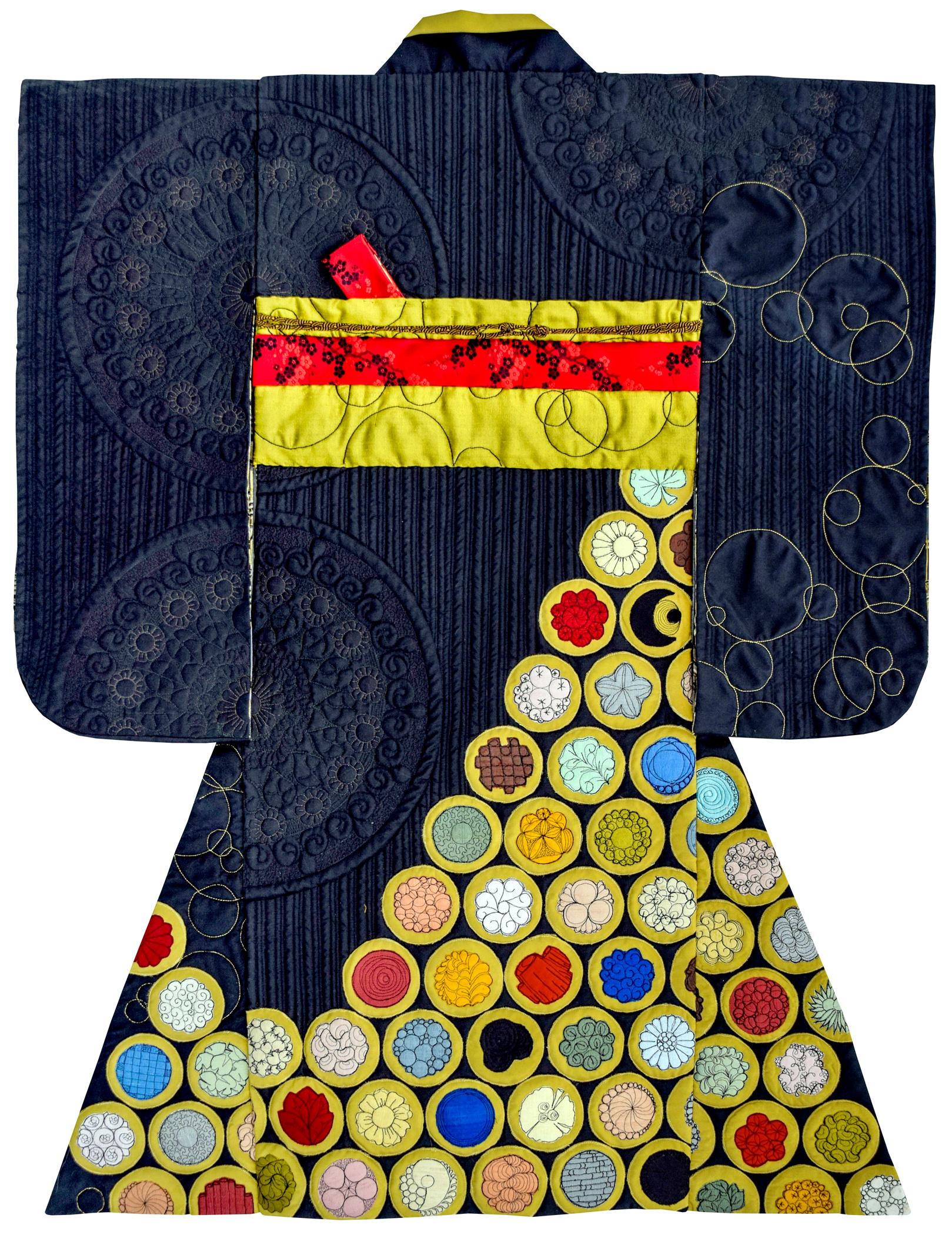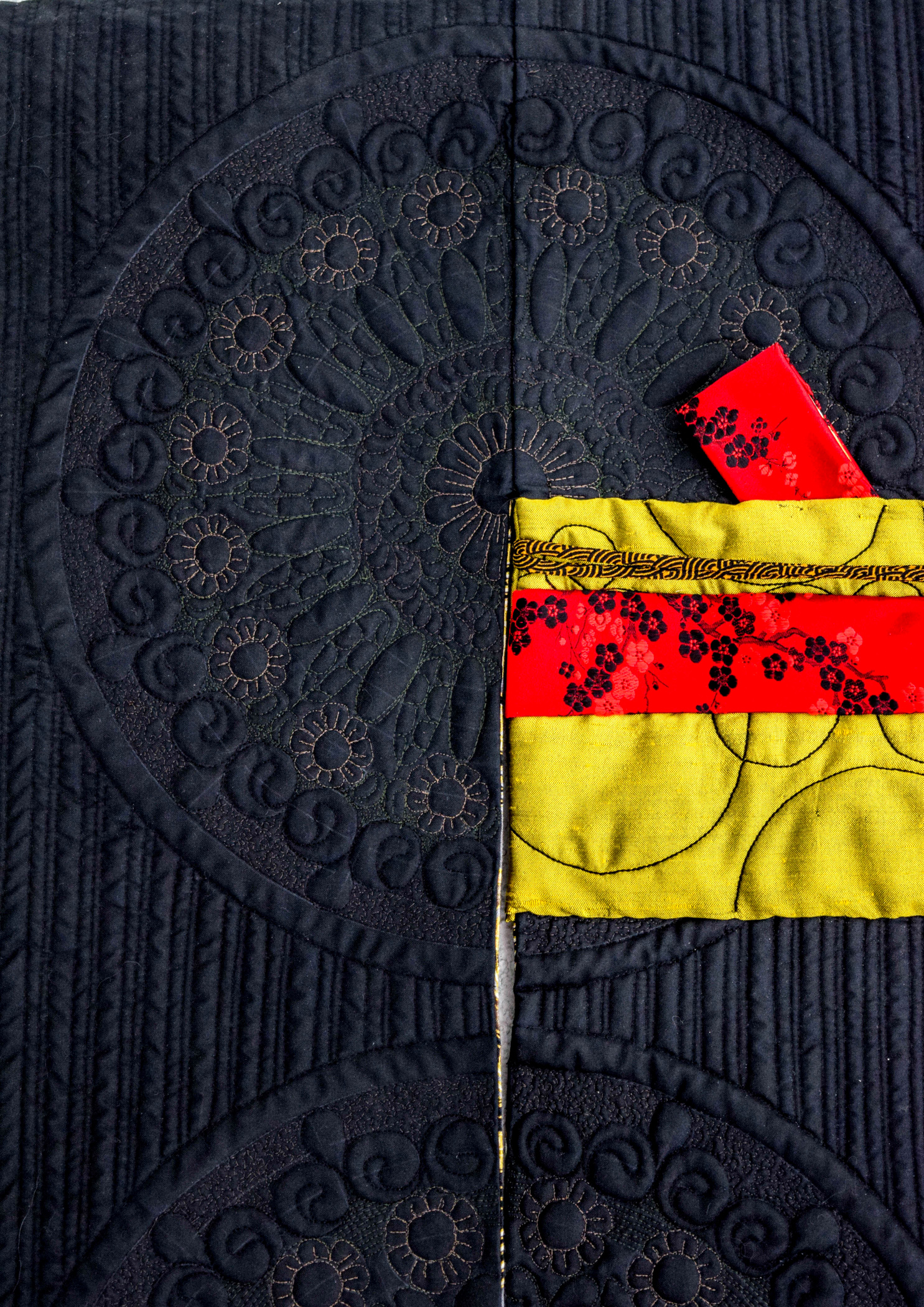 It has been nearly 600 years since the Silk Road created a network of trade routes connecting the Far East with the Middle East and Europe. The cultural and commercial impact changed international gastronomy forever. Spices & Silks is quilted on raw-edge silk to depict the spice markets, and it’s on an iconic silk kimono background. Far East meets Middle East.