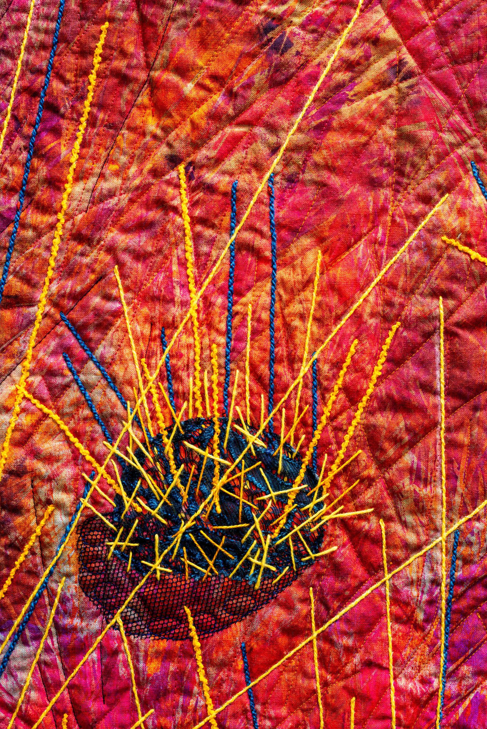 Hand dyed, hand printed with actual foliage, machine couched, hand stitched, machine quilted