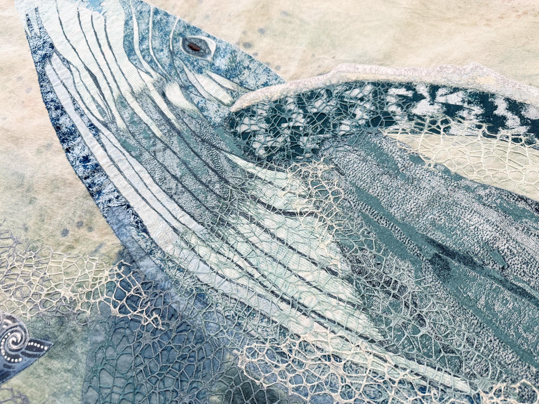 While snorkeling in the Hawaiian islands in the springtime, there's a good chance you'll hear the whales sing to each other underwater. They also breach so they can be heard for miles around. This is their way of communicating for social bonding and territorial claims. I'd like to think that, once in a while, they do it just for fun! This whale I've created, coming out of the water and making a big splash as it dives back down, has this spirit of enjoyment.