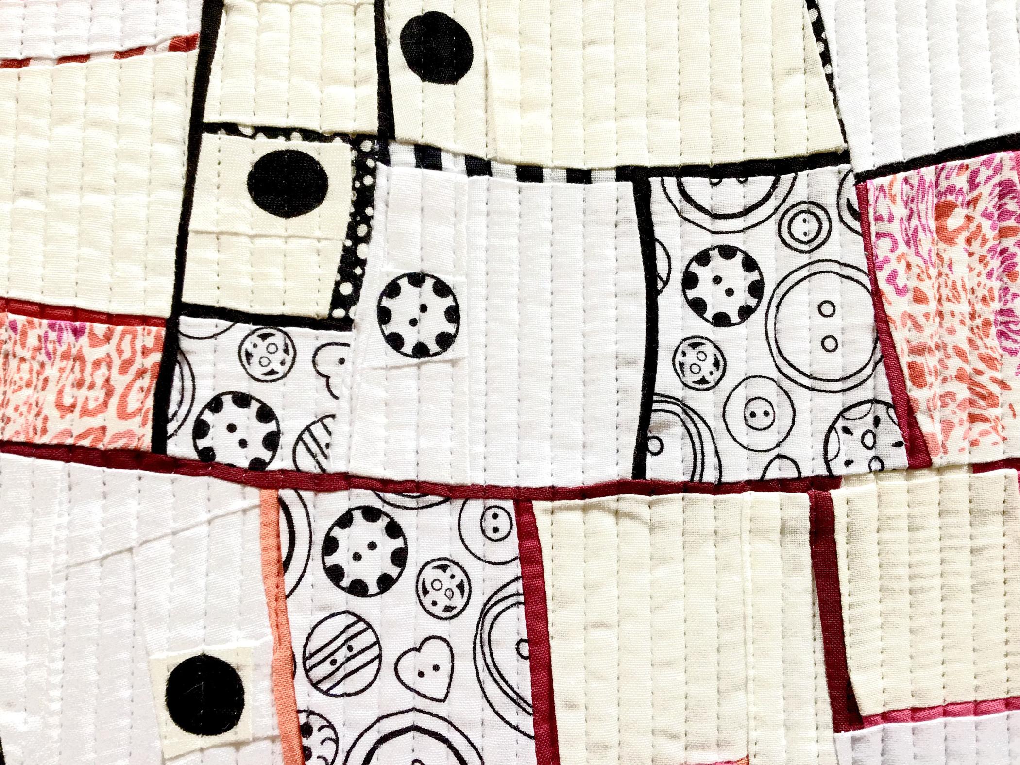 How would you behave if you had a mixed identity, such as that of a black and white dot (pardon, a black and white button) appearing in this quilt? Would you act like the black dots, who are wandering around, exploring opportunities, and searching for a gate to break free? Or would you rather look for safety, hiding within the crowd and pressed inside a box, among all the other buttons that look quite similar you?