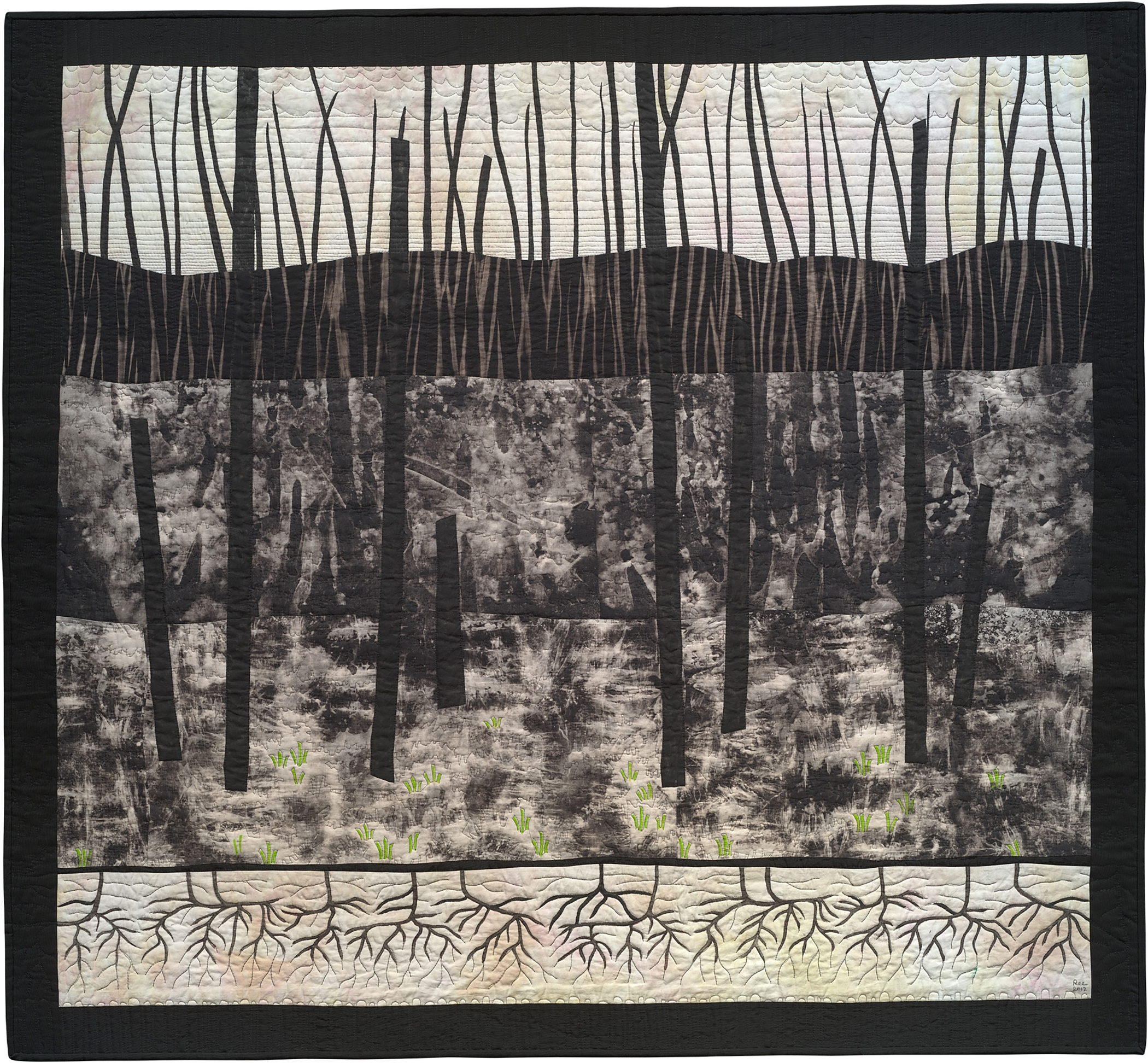 This quilt depicts bare ground and dead trees after a fire. The intensity of the fire will affect how the area will revegetate. If the fire does not burn too deeply, some plants have roots that will re-grow new plants, and can cover the ground area with one species of plants, where previously there were many.