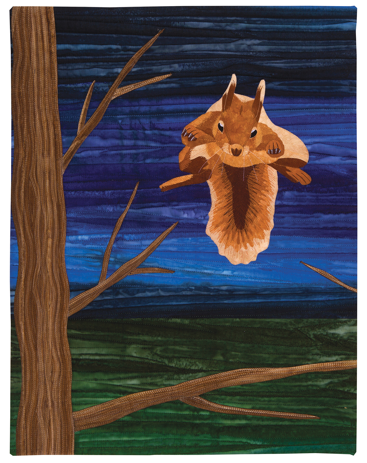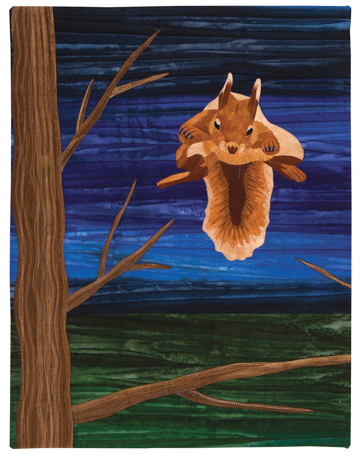 A lone red squirrel soars through the air as it leaps from one branch to another. Scotland’s red squirrels are threatened by a virus called squirrelpox, which has been brought into the country by non-symptomatic grey squirrels. Methods to keep down infection include humane trapping and removal of the grey squirrels, refraining from feeding local wildlife, and thoroughly cleaning wildlife feeders. Infected red squirrels typically die within two weeks of contracting the disease. This quilt was made to commemorate the fight for the survival of Scotland’s Red Squirrel.