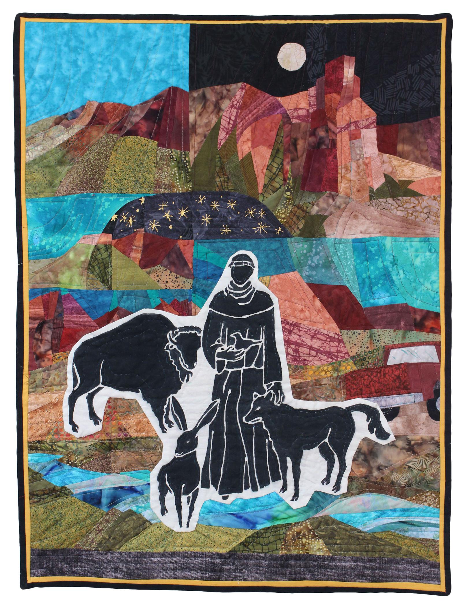 This piece is a loving depiction of the West Texas landscape - specifically the canyons of the Caprock with their rugged, brilliantly colored layers of rock serving as history books to reveal millions of years on our planet. In the foreground is a stream of water, a miracle in this arid land. Many have sought shelter in this canyon from the constant dusty winds and gratefully drank its life-saving water. Comanche were here as well, as well as Spanish explorers, pioneers - and as it turns out - St. Francis and his red pick-up truck were spotted in the company of some of the wild inhabitants of this glorious canyon.