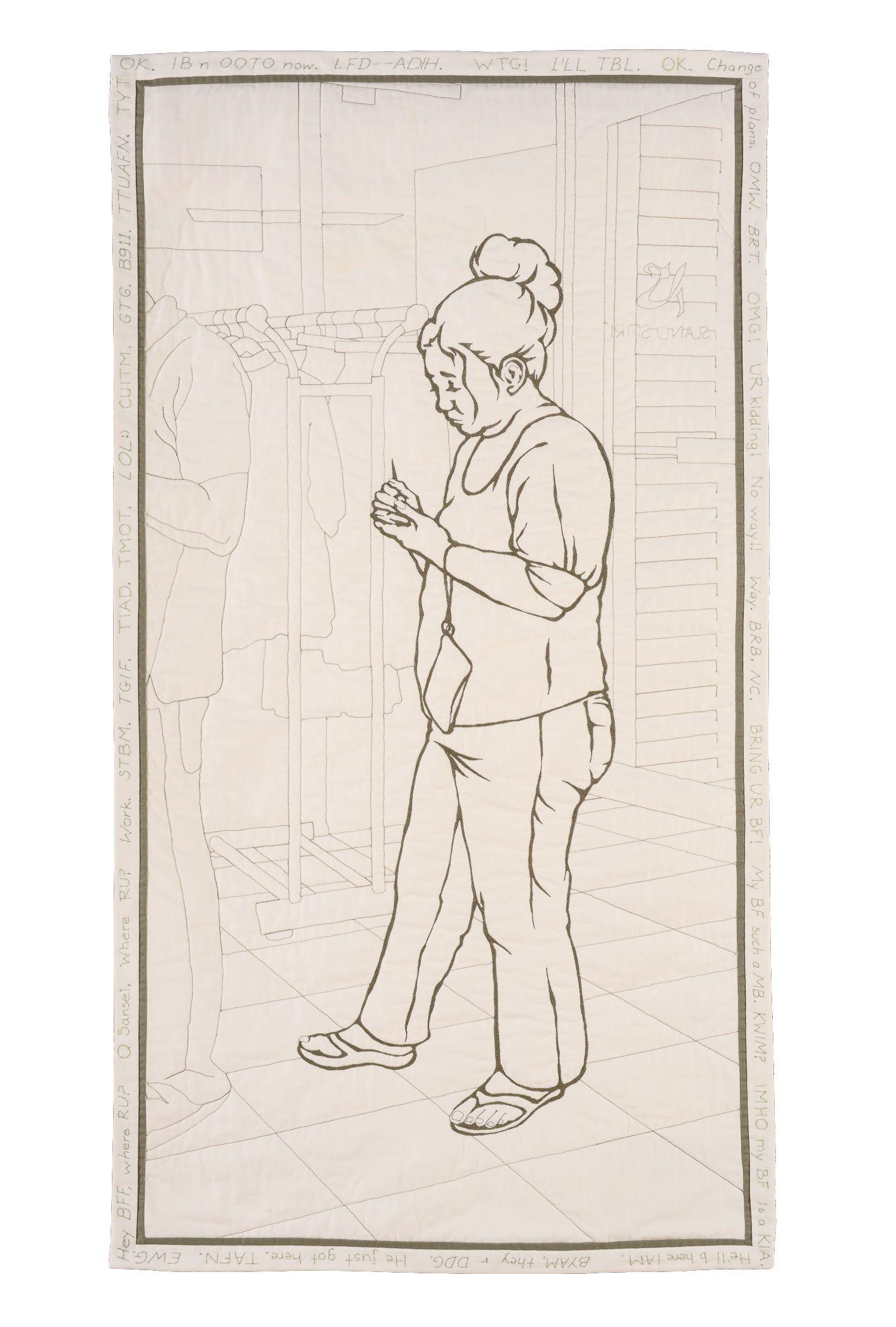 Today we see them everywhere and at any time of the day or night, but in 2010 it was compelling to see people texting and using their cell phones to surf the internet while in waiting situations. I decided to record this emerging cultural shift, and eventually completed a series of six quilts, depicting people of various walks of life using their cell phones.