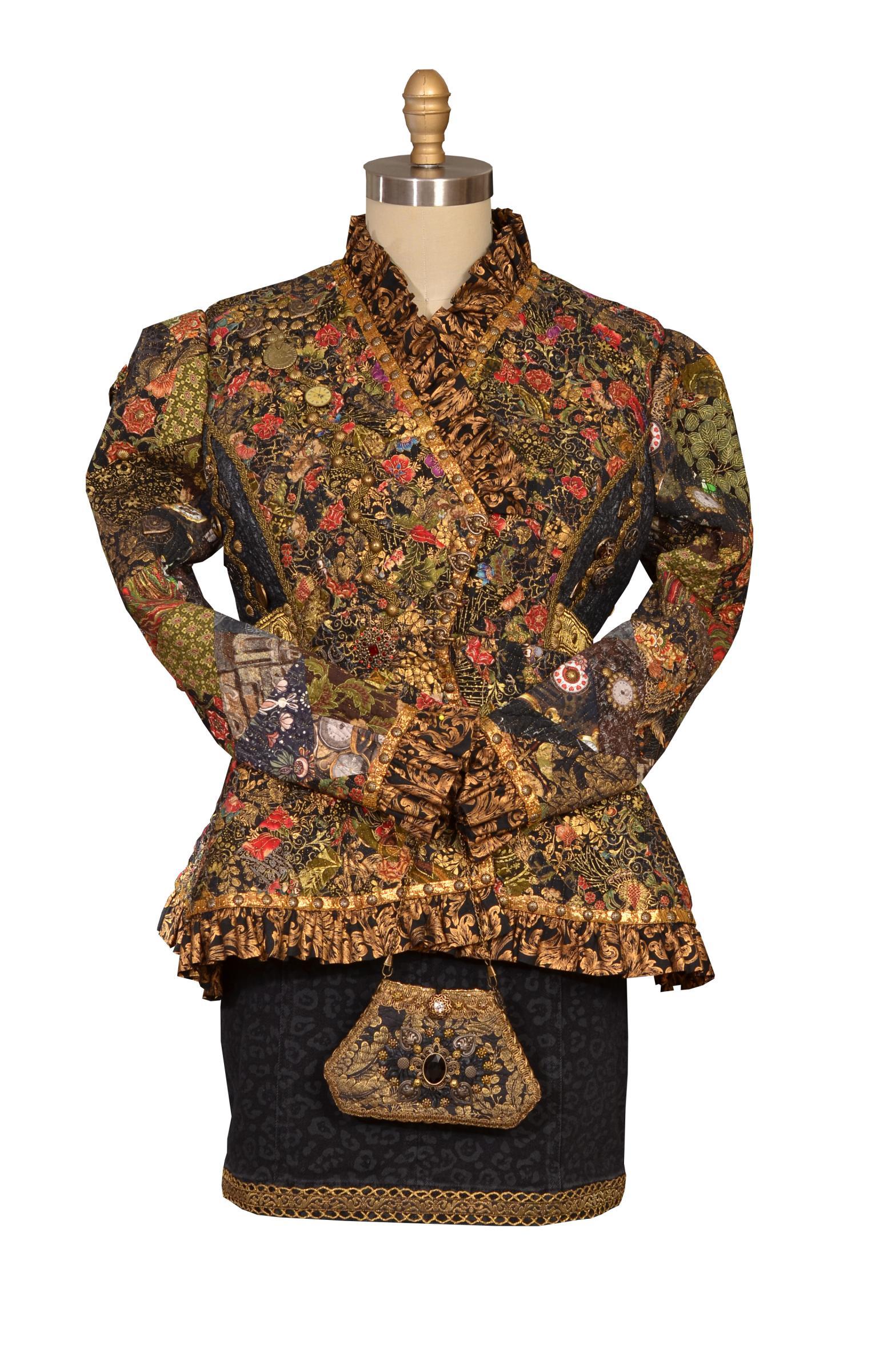 I wanted to imagine an older Alice, magically transported into a steampunk wonderland, with an edgy suit and evening bag replacing her traditional apron dress. The reverse features a Victorian era cameo-like window, including the white hare with his clock and a geared heart. Gears, metallic findings, and a deconstructed pendant become the feminine floral motifs, creating movement.