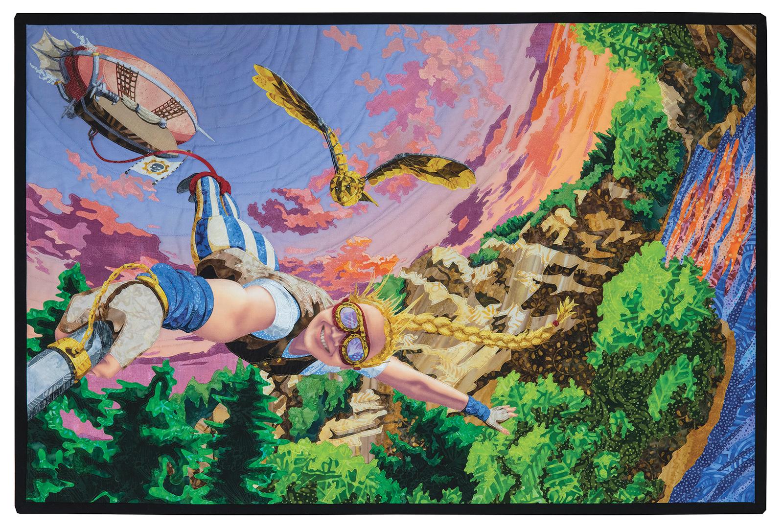 In this steampunk fantasy world, men and women have taken to the skies on massive, steam-powered ships held aloft by hot air, ingenuity, and luck. Most people would be satisfied to soar above the clouds, but not Faith! Her favorite pastime is bungee jumping off the side of her airship, accompanied by Bubo, her pet mechanical owl. This quilt depicts the photo Faith took on her latest jump to test her brand new camera and selfie stick.
