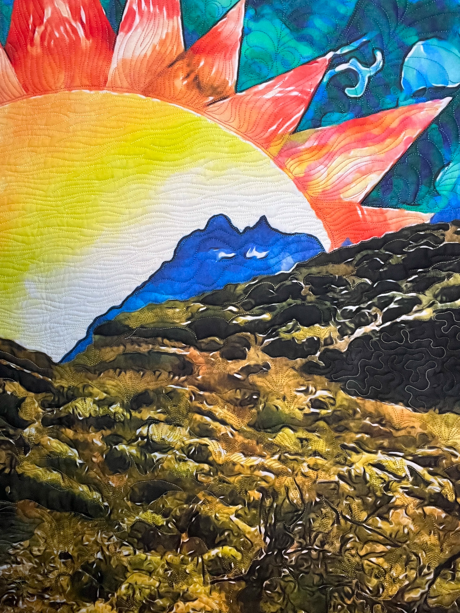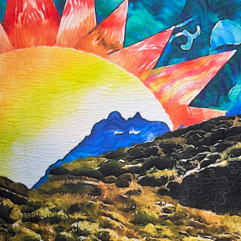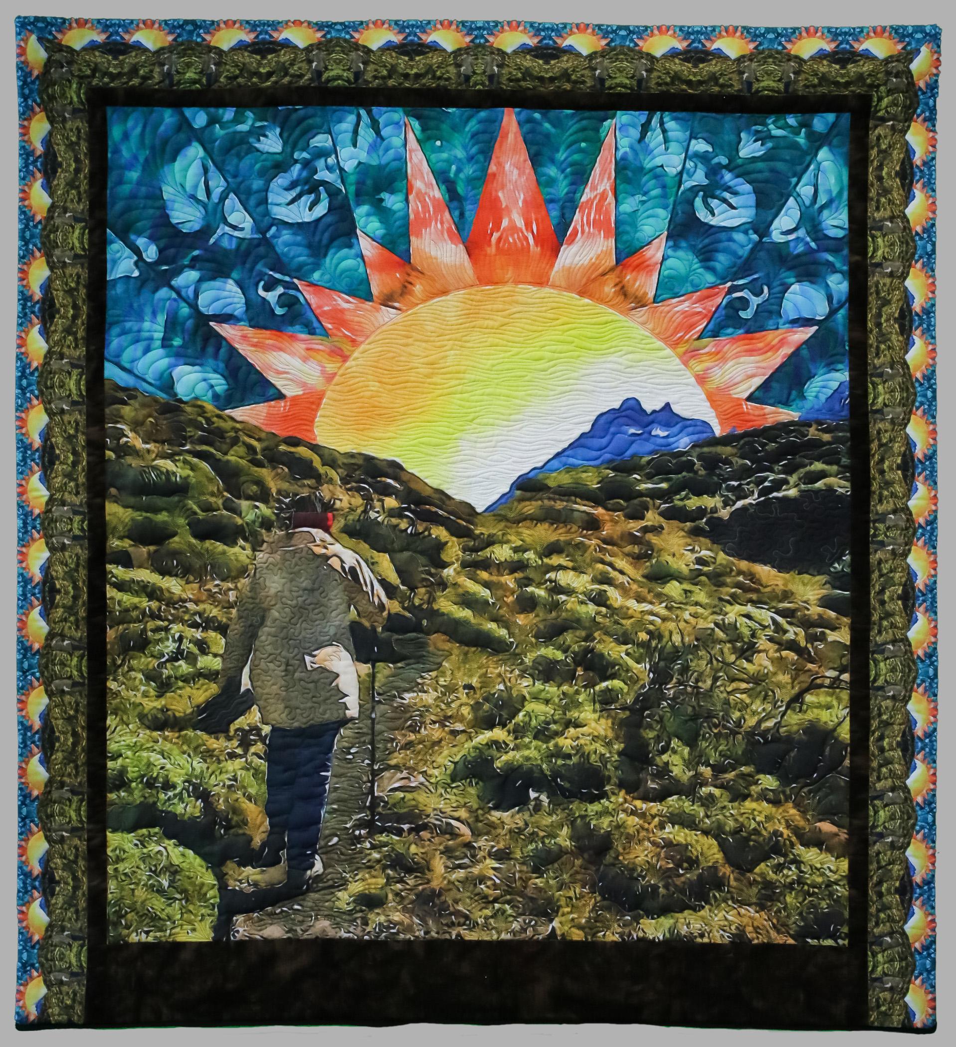 Whether walking along familiar paths or trekking through the steppe of Patagonia, I am lifted to higher levels of consciousness and inspiration by the grandeur and complexity of the natural environment. This collage represents my perseverance as a seeker, one who pursues enlightenment while striving for truth and wisdom. The image is my Patagonian journey, step by steppe to the mountains seeking answers and inspiration symbolized by a pieced quilt block superimposed over a photographed sunrise.