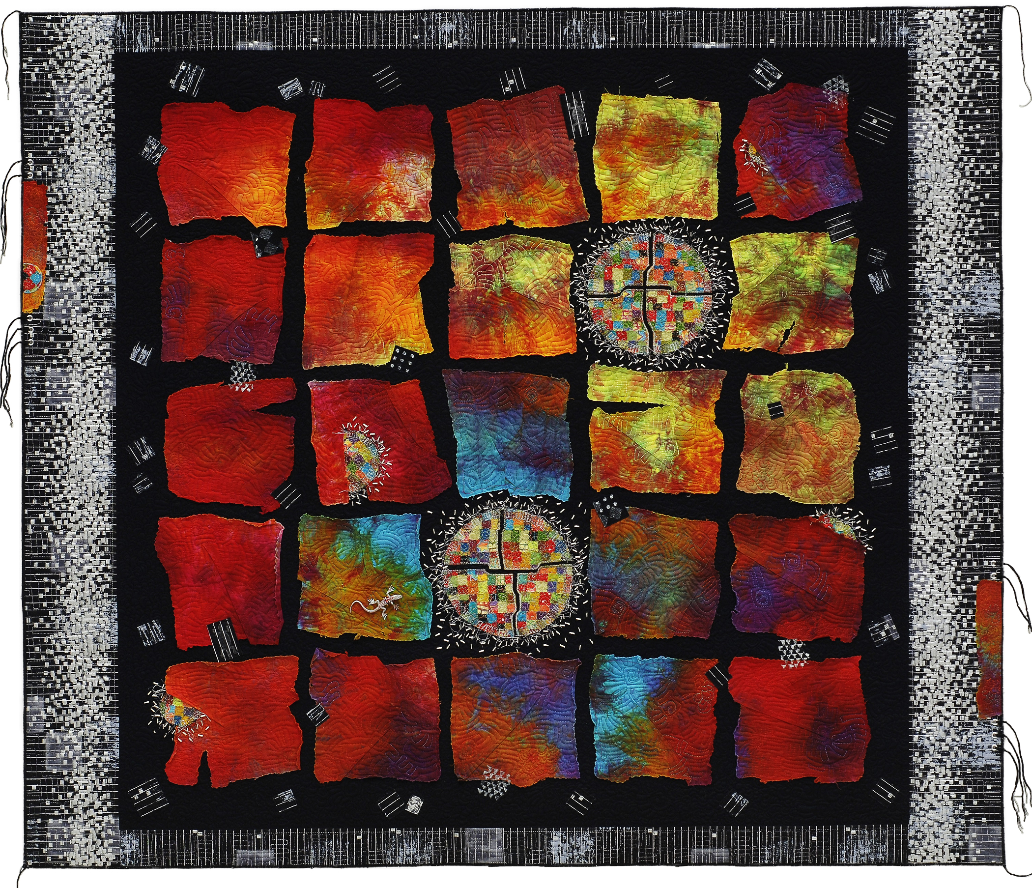 hand dyed cotton, commercial cottons, variety of threads, found object.