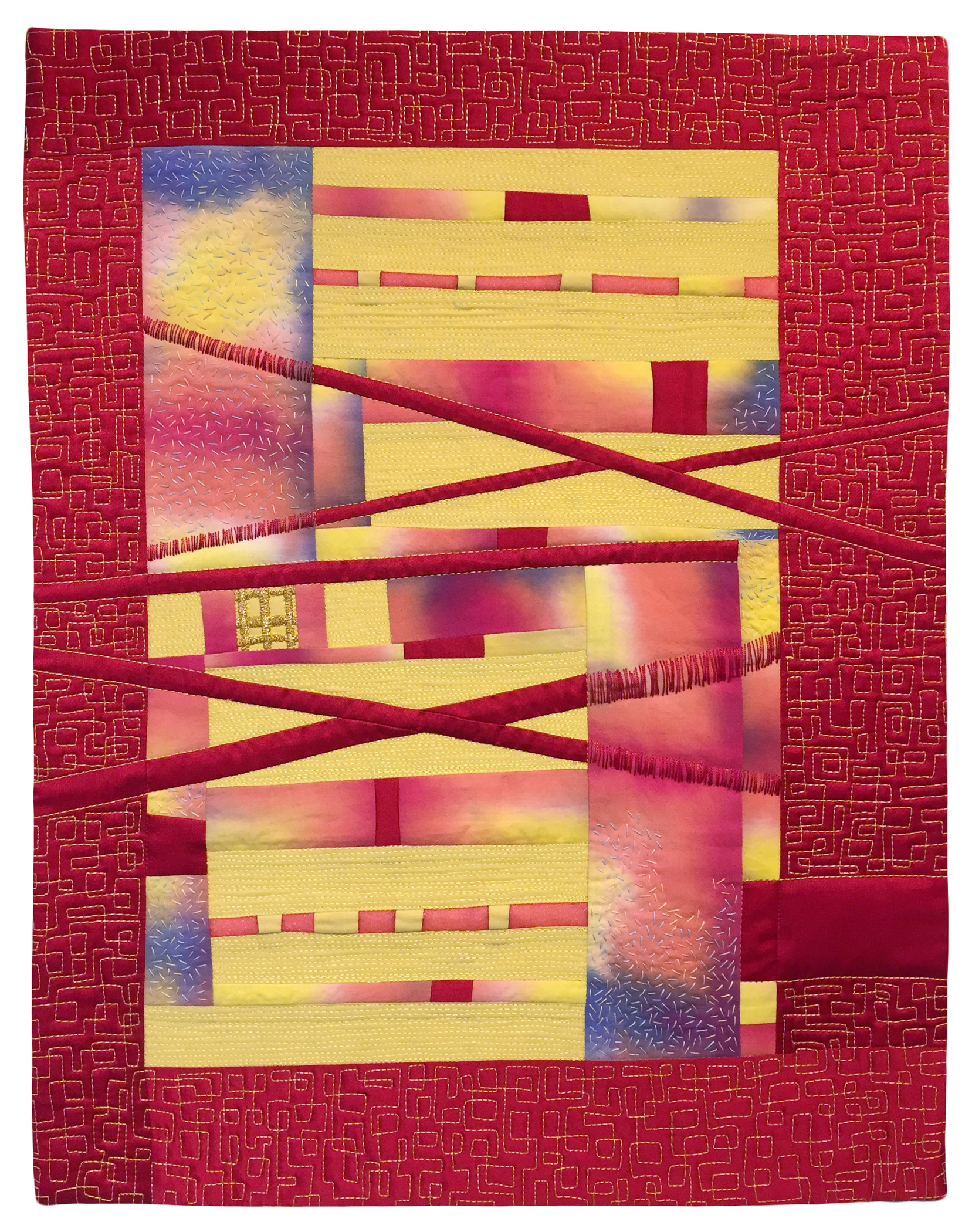 In my abstract work, I'm very interested to explore the emotional weight of color and texture. The colors red and yellow evoke warmth and the feeling of sunny days. However, interrupting random crossing sticks, contradictory materials and jagged lines give a hint of darker times.